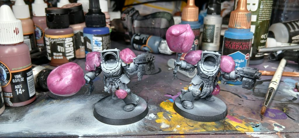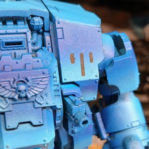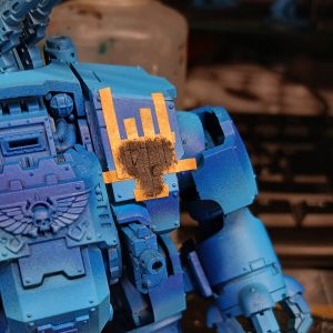 The masking putty protects the yellow already painted on the knee and shoulderpad, as well as the power lades on the axes