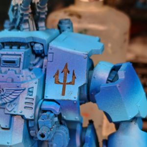 For the purposes of our discussion, there are really 4 different types of mask you can use while doing miniature painting. The first is probably the most common, and one you're likely already familiar with if you've ever done any decorating - Masking Tape. Masking Tape is a paper-based tape with a relatively low adhesive backing (though still too high for our use, but more on that in a bit). Because the tape is cut into one long, straight-sided strip rolled onto a cardboard tube, masking tape is particularly useful for marking out straight lines. If you're thinking the ever-present and very striking Hazard Stripes that adorn our Warhammer miniatures when I say that, you are absolutely correct, but other designs can also benefit from using masking tape, as long as they include straight lines, like the trident on this Emperor's Children dreadnought: