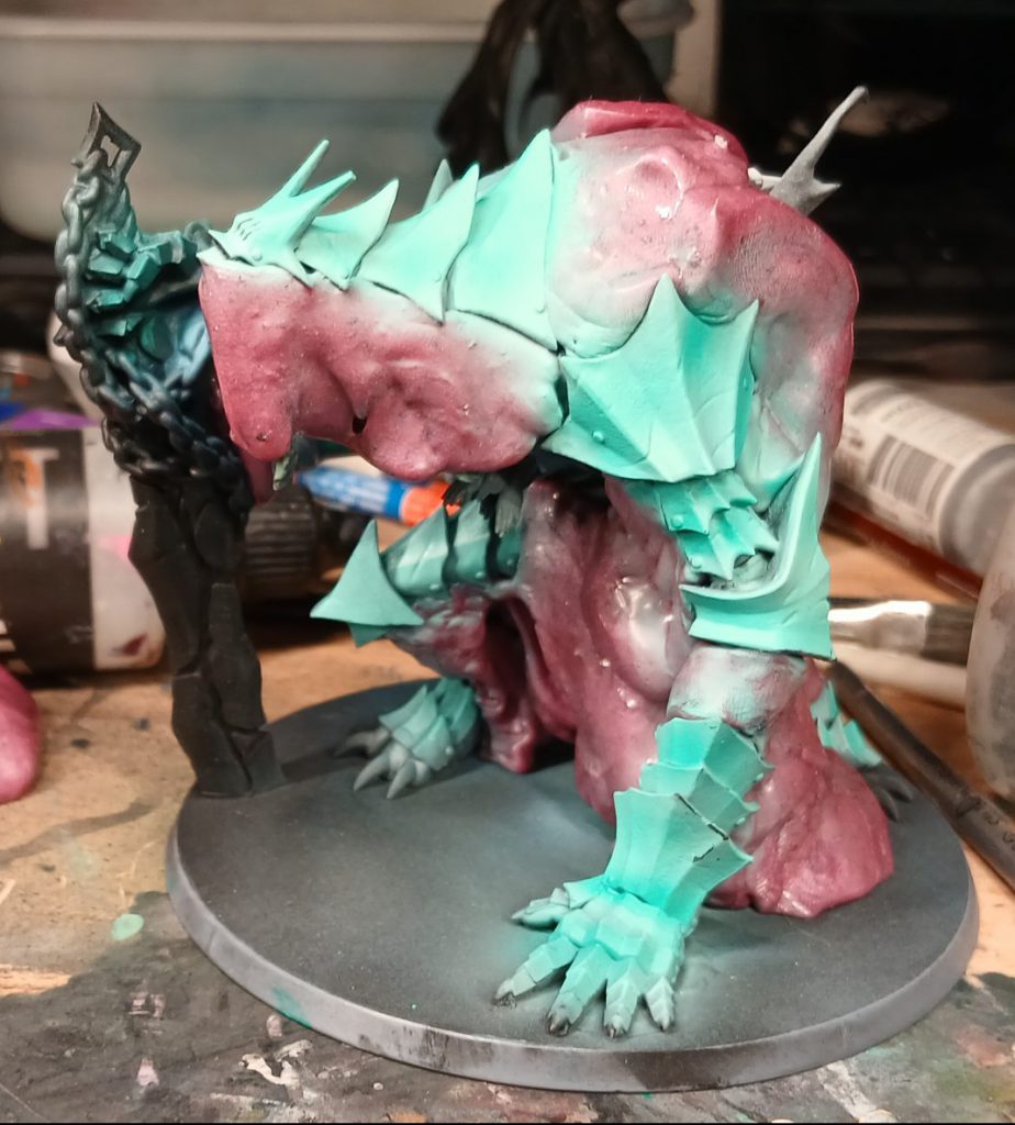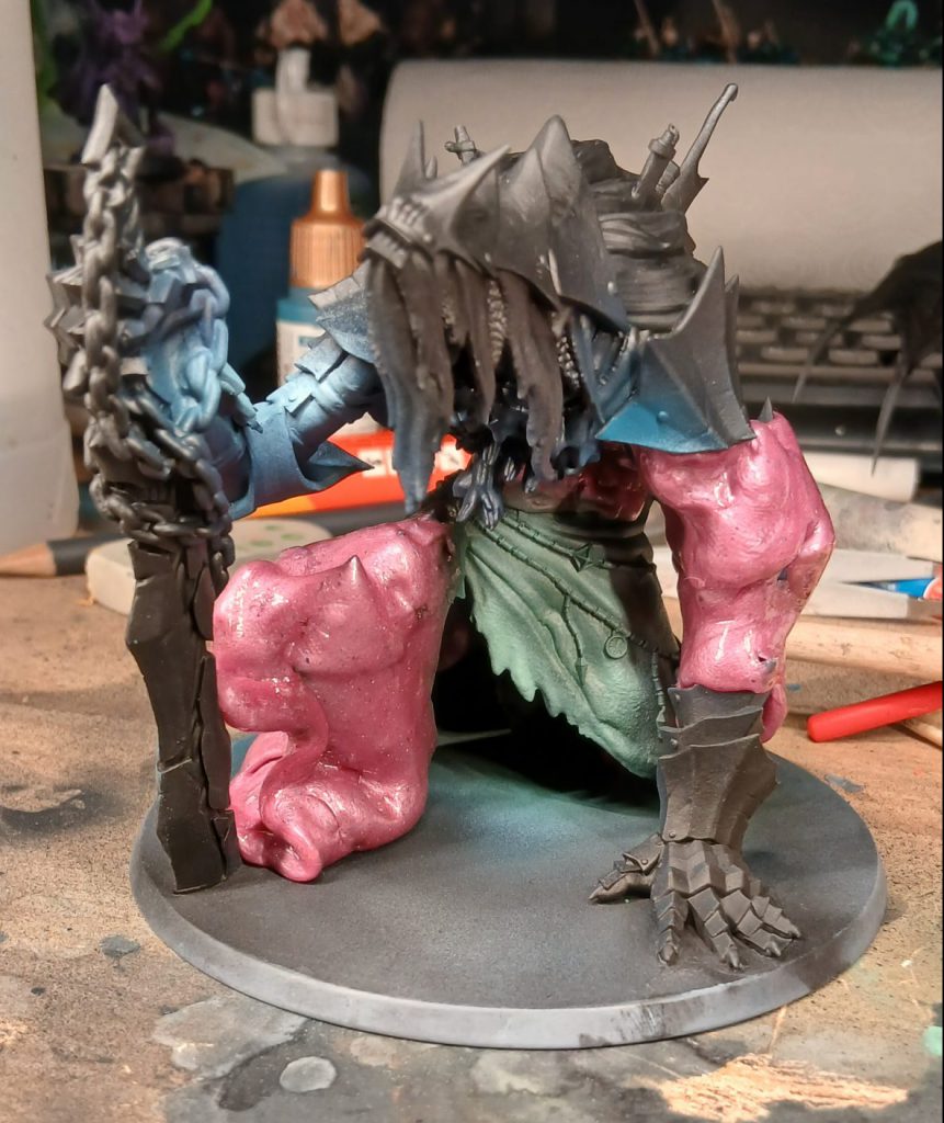 The putty protects all the already-painted skin and cloth while I spray the verdigris base of the bronze armour