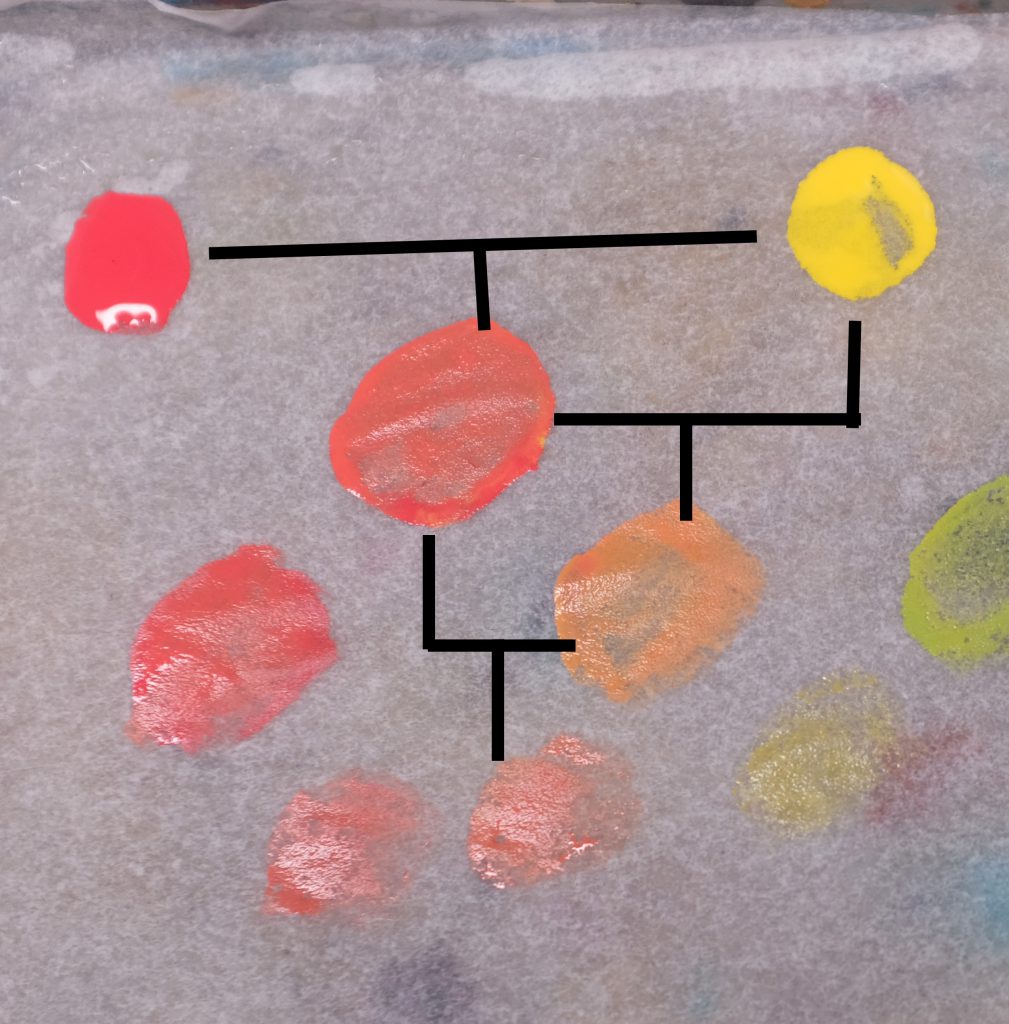 So we start from the primaries, mixing them in a 1:1 ratio to make the secondaries in the second row. Then in order to make the tertiaries, we mix the secondary 1:1 with a primary colour, and so on for the quarternaries, mixing 1:1 a tertiary with secondary. I've tried to illustrate the relationships with this family-tree diagram: