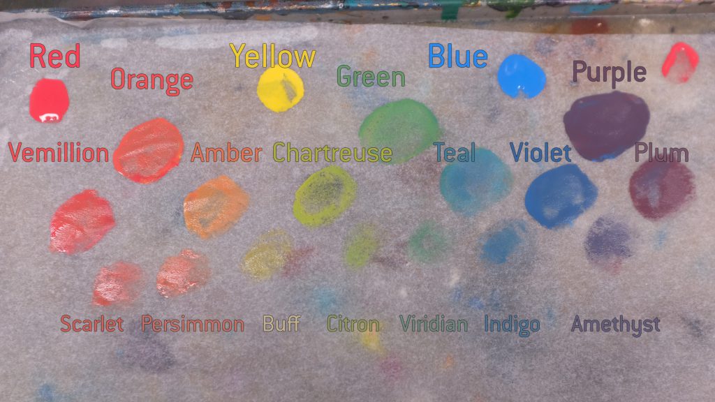 From just these three primary colours we can mix a ton of different colours, I've given their traditional names below, but people call them all sorts of things.
