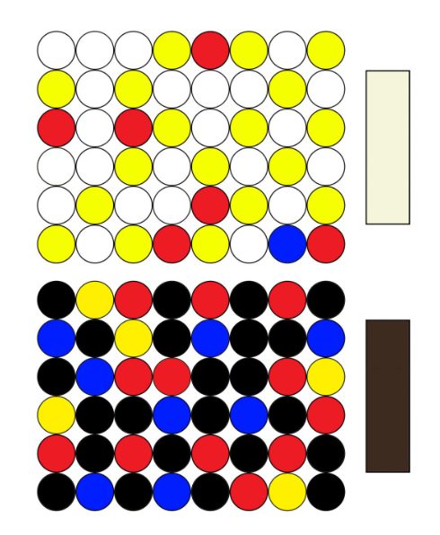 Beige, for example, has only a trace amount of blue, while yellow and white dominate the mix, making it a very light, warm, brown; bistre, on the other hand, has a lot of blue and black, with less yellow, making it a very dark, cold brown. By adjusting the ratio of these core elements, the primary colours, black, and white, we can make just about any colour you can think of through mixing.