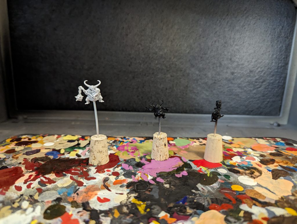 Now to the two I primed black. You may recall that generally you want your one-coat paints going over bright colors, so why prime black? This is because I’ll be using them to cover Underpainting. The idea behind underpainting is that you leave the recesses of your model black and try to get the highest point of the model white. For a very advanced read on this topic, check out our art school level article on Underpainting.