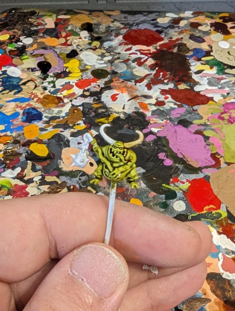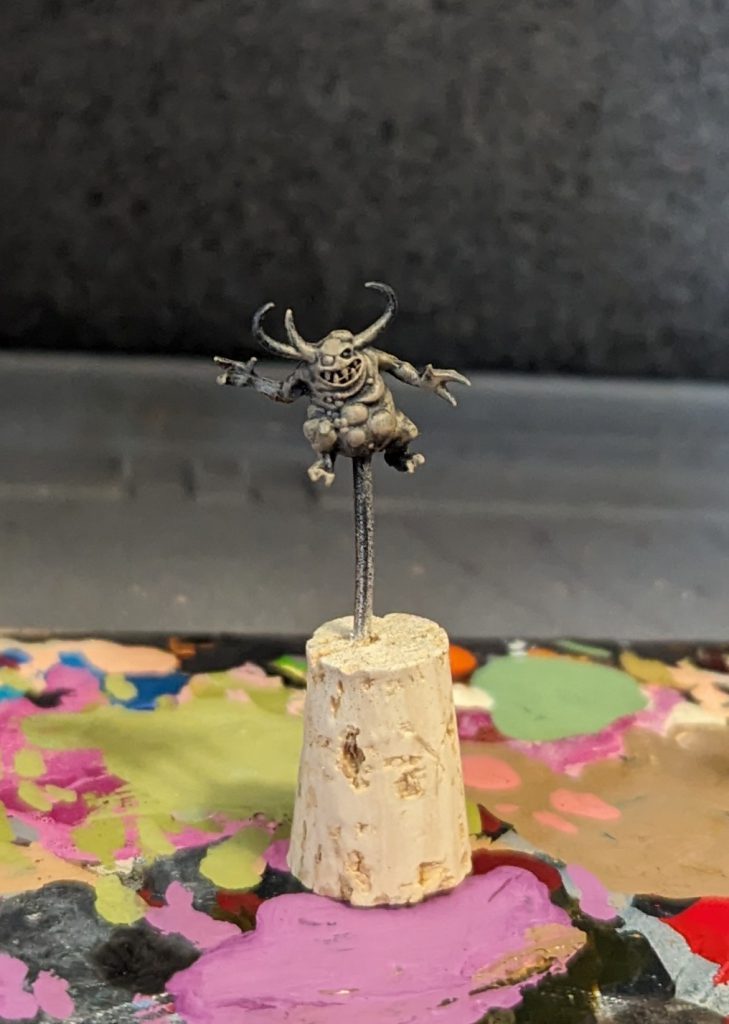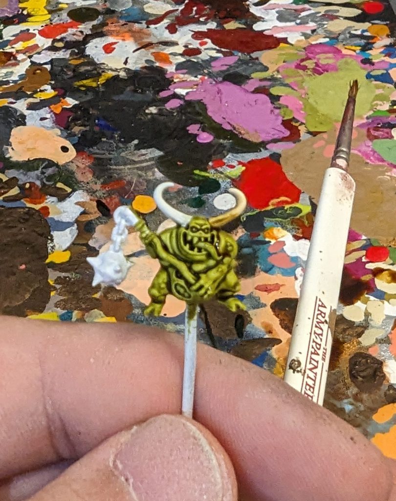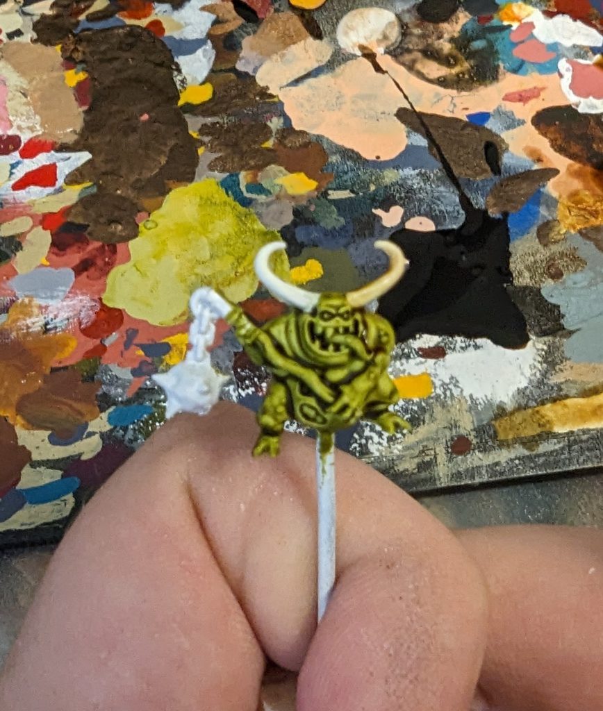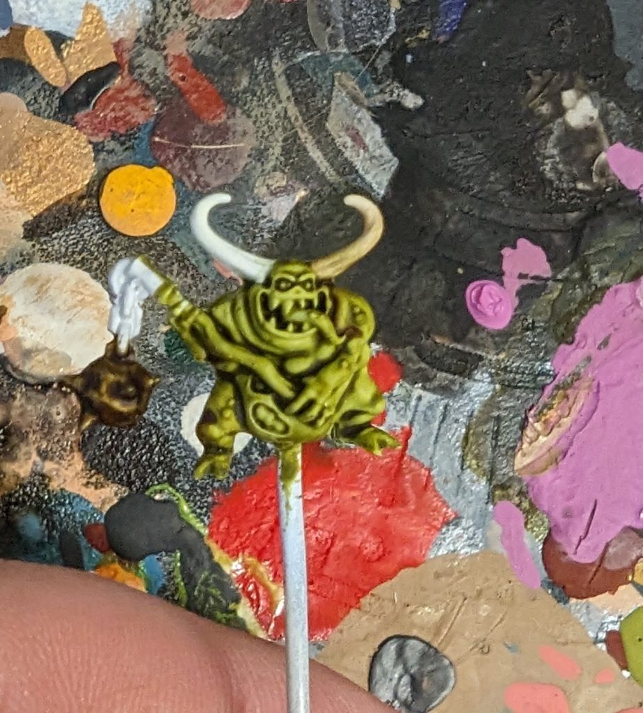 One more thing one coat paints are great for is creating smooth transitions between two colors. For this example I’ll be painting this nurgling's horn using Army Painter’s Brownish Decay and Pallid Bone. Pallid Bone is way less intense than Brownish Decay and makes for a great subtle one stop shop for bone. However I want the roots of the bone to look more decayed and diseased closer to the nurgling and Brownish Decay is great for this. So I’ll be painting a gradient using the two speedpaints.