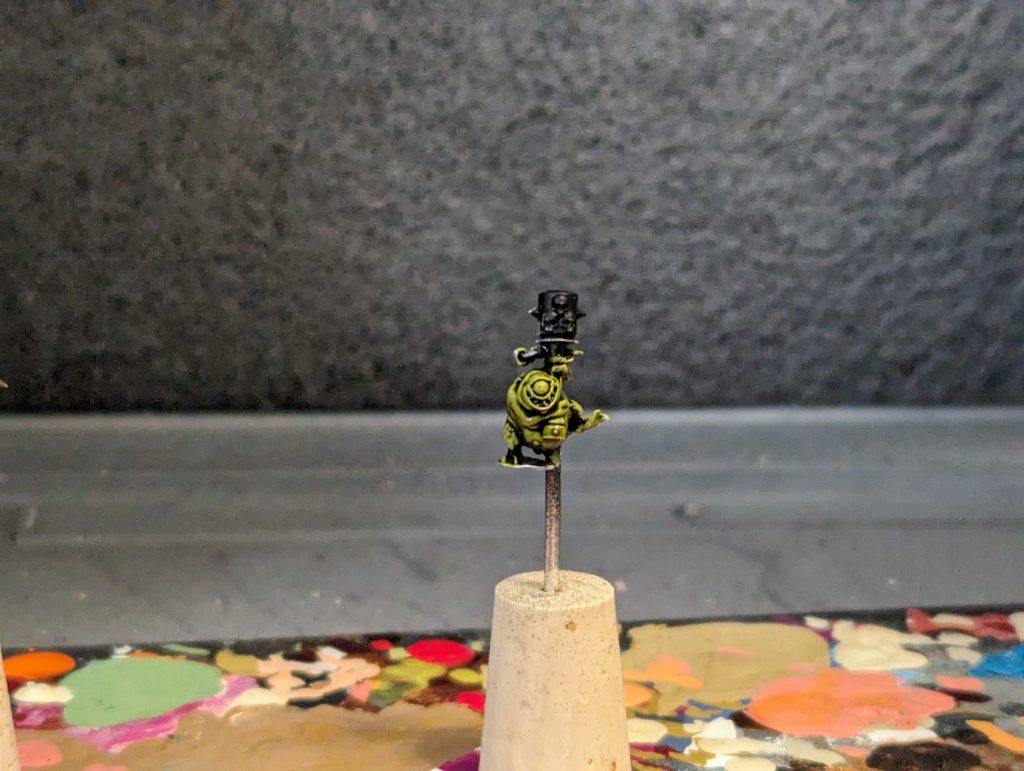 Once we apply the Charming Chartreuse you’ll see while it is green, the model looks a bit more grody with a much darker skin tone since that khaki color is coming through a bit on the raised and flat parts of the model. While this adds more depth, this led to the model being a lot darker than the others, so it may need some acrylics to pop stuff back up if you want to.