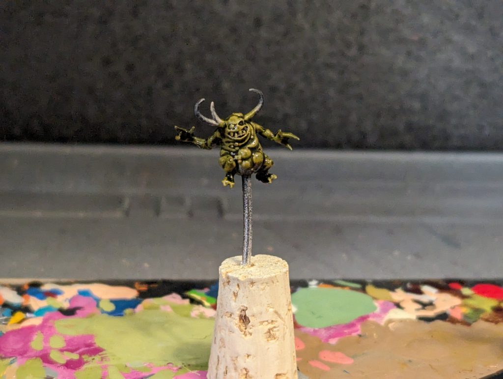 So what about that third nurgling? Well now let's talk Filtering. A filter is when you take a color other than white and layer your one coat paint over it thereby adjusting the tone of the color. In this case I’m going to follow the same steps as above for underpainting but use Army Painter Burnt Turf instead of white for the overbrush.