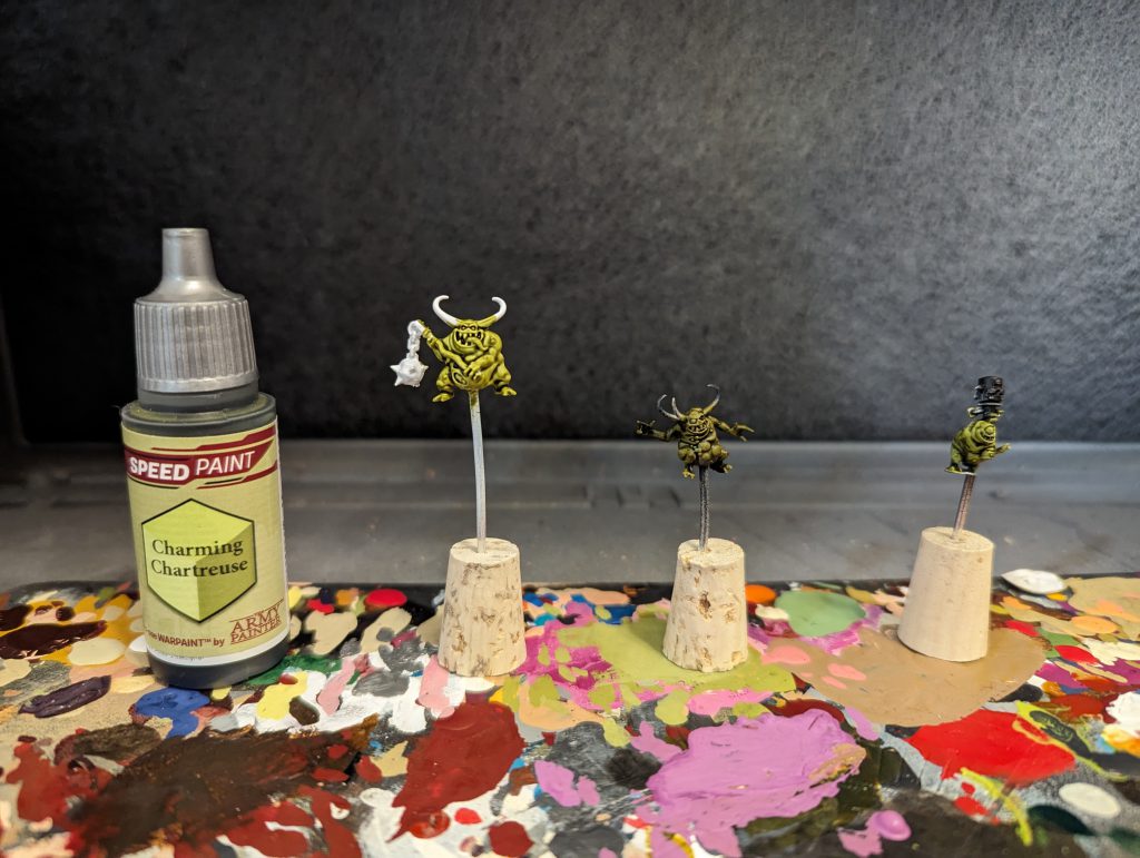 Here we have three Nurglings I primed for this article. You’ll notice one is primed as you’d expect, but the other two are primed black. we'll get to those two in a second but first lets establish a baseline for our lessons. Here's the white primed nurgling hit with Army Painter Charming Chartreuse.