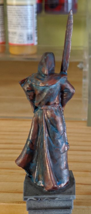 This miniature illustrates a great application of verdigris to show weathering on a bronze statue. Notice now the effect is concentrated in the recesses, giving a very natural and realistic look. Easy and super effective!