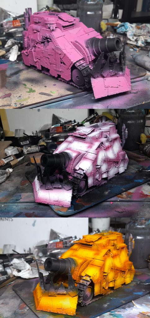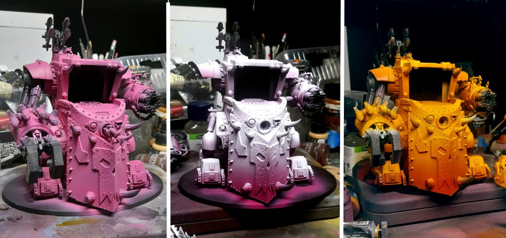 What about the next level? Well.. how about painting over your zenithal highlighting with some transparent paints like contrast paints or inks? By using transparent paints we can retain most of the value information (lights and shades) while changing the colour. Pretty nifty. YouTube legend Marco Frisoni often uses this technique a lot in his painting, to incredible effect. The problem with Marco's technique is that it requires a small nozzle and an incredible amount of extremely fine airbrush control - but that's ok, you can still do your main colour this way and it'll look great. For example, I did the popular "undercoat pink to paint yellow" technique on this Ork tank and Gorkanaut.