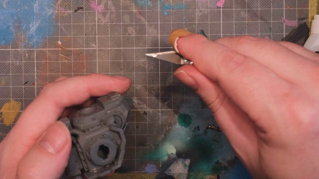 This time I’ll be magnetising the chest guns on this Space Marine Brutalis Dreadnought. Here you can see the completed magnetisation of one side that I finished earlier, and how easy it is to just pop the guns in and out, safe in the knowledge that they won’t fall out. To demonstrate the process on the other side we’ll need a hobby drill and some magnets, make sure that the diameter of the drill-bit you’re using matches up to the size of the magnets so the fit is really snug. We’ll start by drilling a hole here, the angle isn’t perfect because of an overhanging piece I should have left off, but with a bit of care I drilled out a nice neat circular hole.