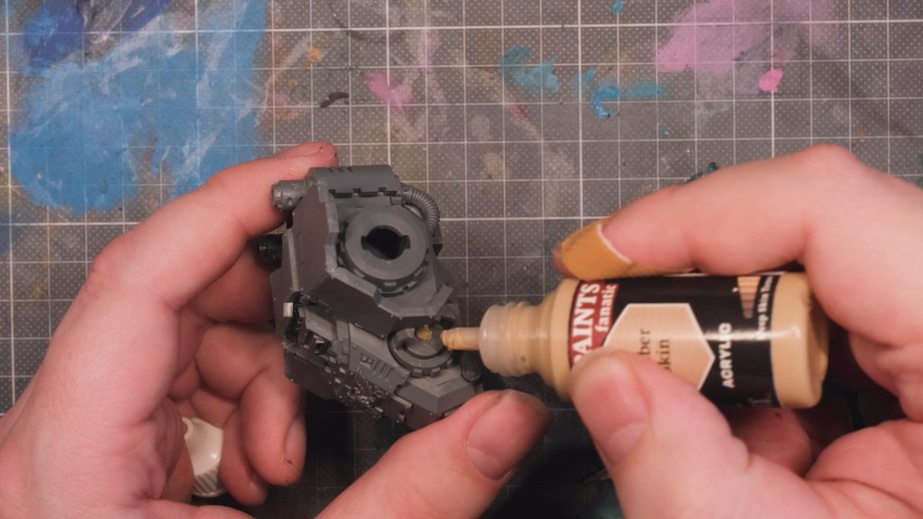 Okay, so how do we make sure that the holes match up properly so the magnets meet correctly? It’s actually quite simple: By putting a blob of paint on the magnet that’s already glued in and then putting the pieces together while the paint’s still wet, we get a handy mark on the undrilled piece - in this case, since we’re pushing the paint forwards into the model when we put the pieces together, we can be sure that the point where the paint stops is the outmost edge of the magnet. By drilling there, we get a nice hole that should line up perfectly. Once you’ve done that, scrape the excess paint off the magnet so you don’t make a mess.