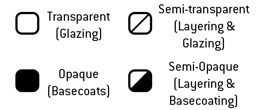 Now, miniature paints almost never have these symbols on them (and honestly, I wish they would), instead often using descriptive language in their marketing to attempt to explain how opaque their paints are. An example: Citadel separates paints into several categories at the point of sale, so if you buy, say, a pot of Bugman's Glow base paint, you can be fairly confident that it'll cover reasonably well.