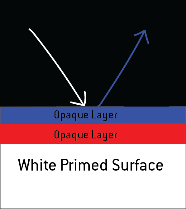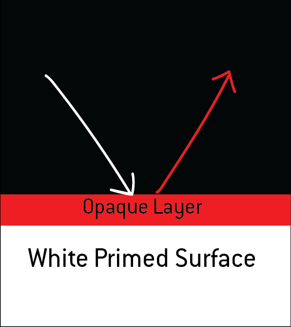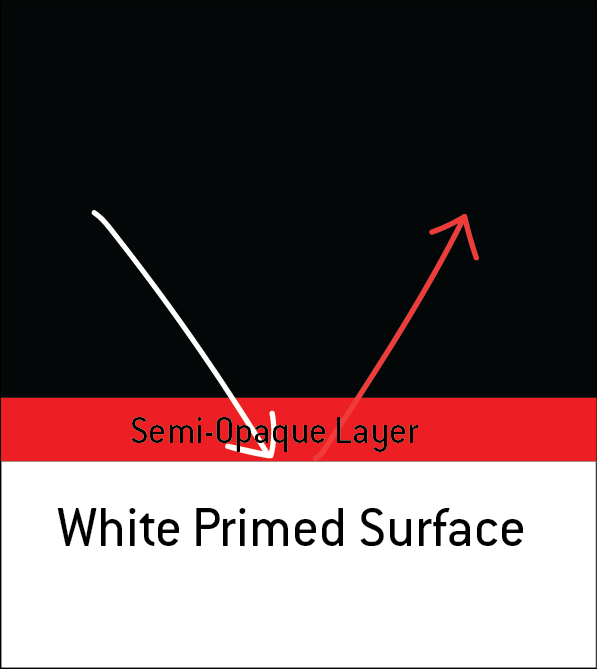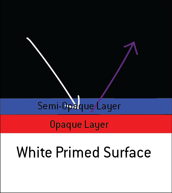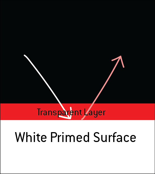 On the other end of the scale are watercolours (not relevant for us, but they are) artists inks, certain colours of normal acrylic (magenta and yellow are often pretty transparent, for example) or the more recent deluge of transparent paints designed to go over a white or off-white basecoat (AP Speedpaint, Citadel Contrast, Vallejo Xpress Colour et cetera), these paints do vary somewhat, but almost all of them allow most of the light through to the layer underneath. Citadel used to sell some very highly-regarded Glaze-specific paints, but they stopped, presumably in order to eliminate confusion with the Contrast line. A thin layer of these paints on a flat surface will (sometimes drastically) alter the