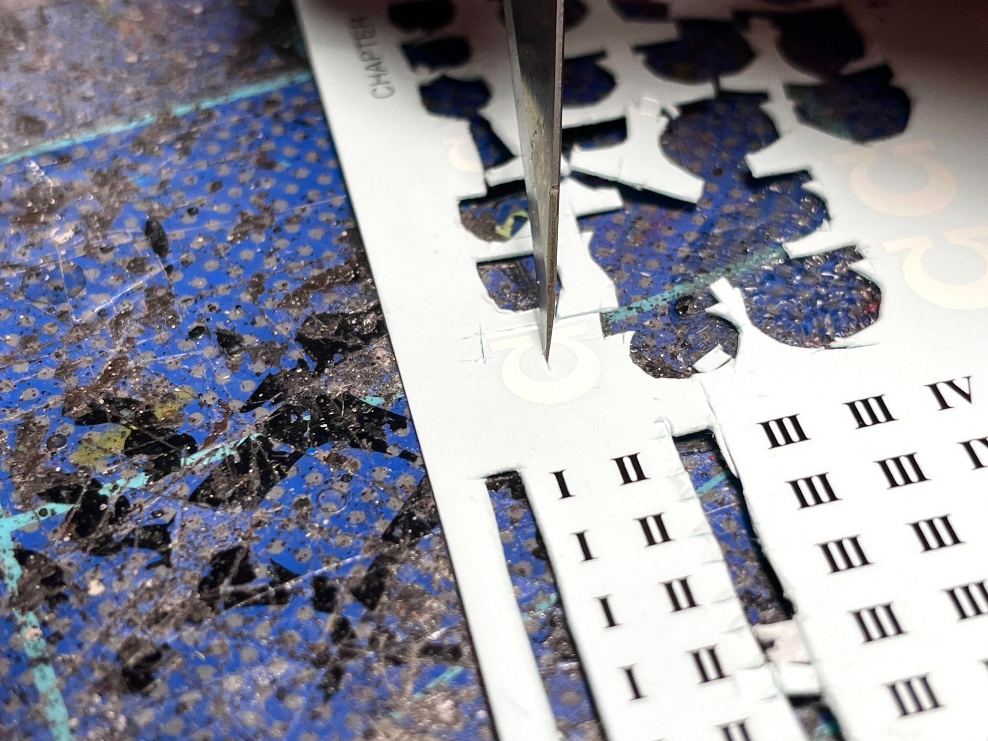 SRM: The first tool you'll need is a sharp knife with a fresh blade to cut out your transfers. A dull blade can catch on the paper, tearing or wrinkling the transfer, or skip and suddenly find its way into your thumb. A sharp blade will cut cleanly and evenly, and offer you more control. You'll also want a surface like a self-healing mat, thick cardstock, or something similar to have under your transfer paper and keep your table from getting cut up. Once you've got your workspace ready, simply cut around the transfers you want to use on your model and set them aside. Apply firm, even pressure whilst cutting, only pushing enough to cut the paper. If you didn't cut through the first time, you can always go back for a second pass. It's better to cut twice than push too hard and snap a blade. You should leave a bit of space around the design itself, but be careful not to cut the actual transfer. I like to cut out all the transfers I'm using on a model at once, and place them next to it on my workspace. If I'm working on multiple models at once, I'll group them accordingly.