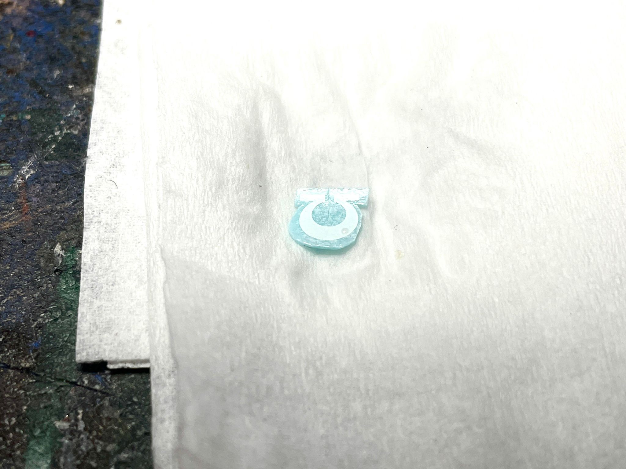 SRM: Transfers release from their paper with moisture, so you're going to want some clean water to assist. Old paintwater (or other, less savory liquids) might stain the transfer or the area around where you're applying it, so stick with fresh water from the tap. Dampen some tissue paper or towel with the water and place it on your desk. Now, put your transfers on that same wet paper, and let the water do its work. You can also use a clean brush to put more water on top of the transfers to help them separate, or skip the tissue entirely and let the transfers separate in a shallow dish of water (or a puddle on your desk if you're a goblin). Different manufacturers and sheets may take different times to separate, so be patient. It shouldn't take more than a minute for the transfer to lift off the paper. Now that your transfers are ready to work, it's time to move on to the next step.