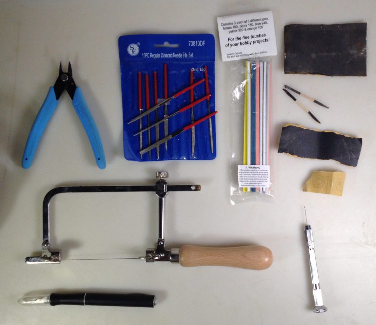 Clockwise from top left: Clippers, Needle file set, sanding sticks, sandpaper, pin-vise, x-acto knife, jewelry saw.