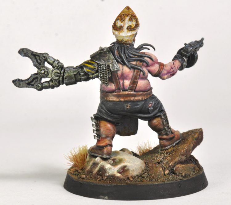 This power fist is from the Orlocks kit. It didn't quite have the feel I wanted, so I replaced the fist with the blades of a rock-cutter from the Genestealer Cult Acolyte kit. The fist portion was cut away, following the lines of the wrist section.