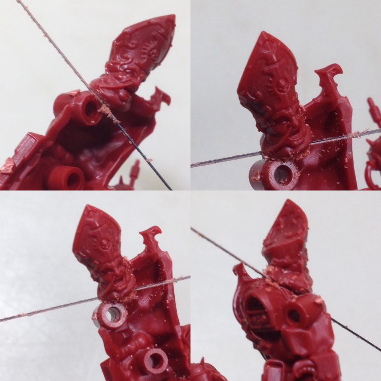 The first step was to remove Taddeus' head. This was done carefully with the jewelry saw. I was careful to cut slowly from each side of the head to do as little damage to the body as possible. Throughout this project I wanted to preserve the unused parts for potential use. The jewelry saw is great for this because it has some flex and slightly turn as it cuts. I have snapped the blade on it before so you have to develop some tool sense in regards to how much bending you can get away with (thankfully this one came with a bunch of extras).