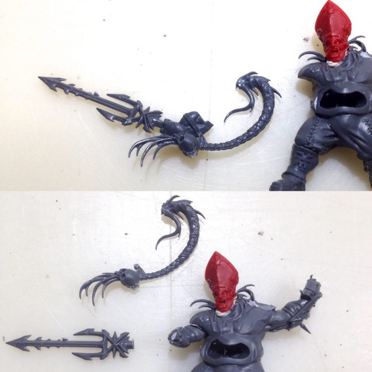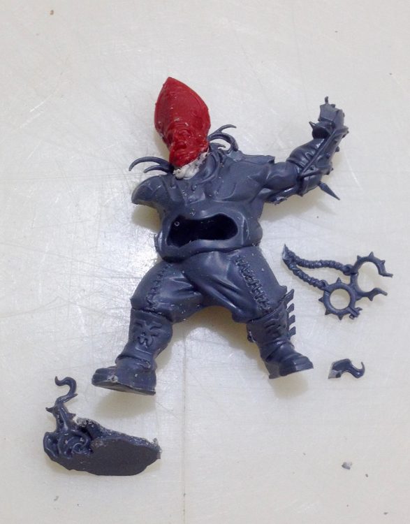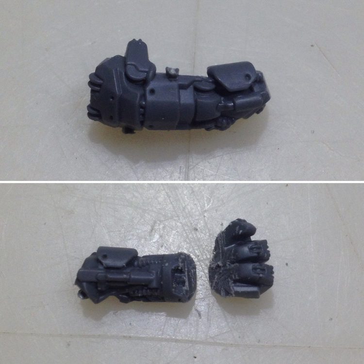 Next, the arm was separated from the hair/skull bit and the spike/blade was removed. These were cut off with the x-acto blade. Again, these are two more cool bits that could see some use for something else.
