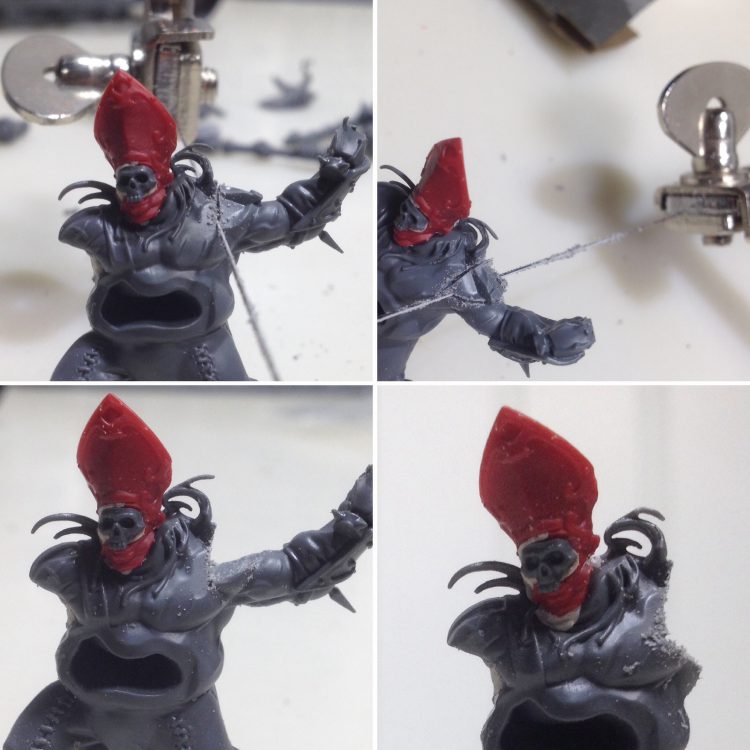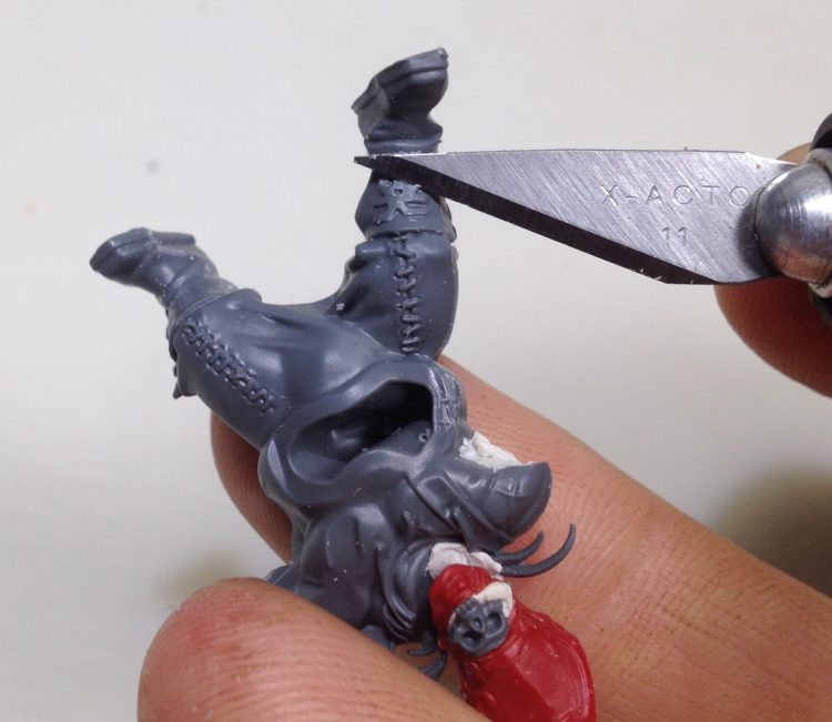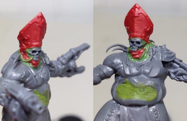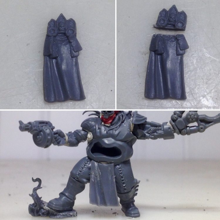 Now to deface that hat! The ministorum symbol was carefully shaved away with a sharp x-acto blade. Once it was mostly flat, sandpaper was used to do some final smoothing. The x-acto was used again to carve the back of the neck down to fit on the body. It's important here to cut away a little, then test fit until things line up nicely. Cutting too much away isn't too big of a problem though, because green stuff can compensate for any overzealous carving.