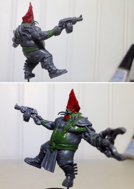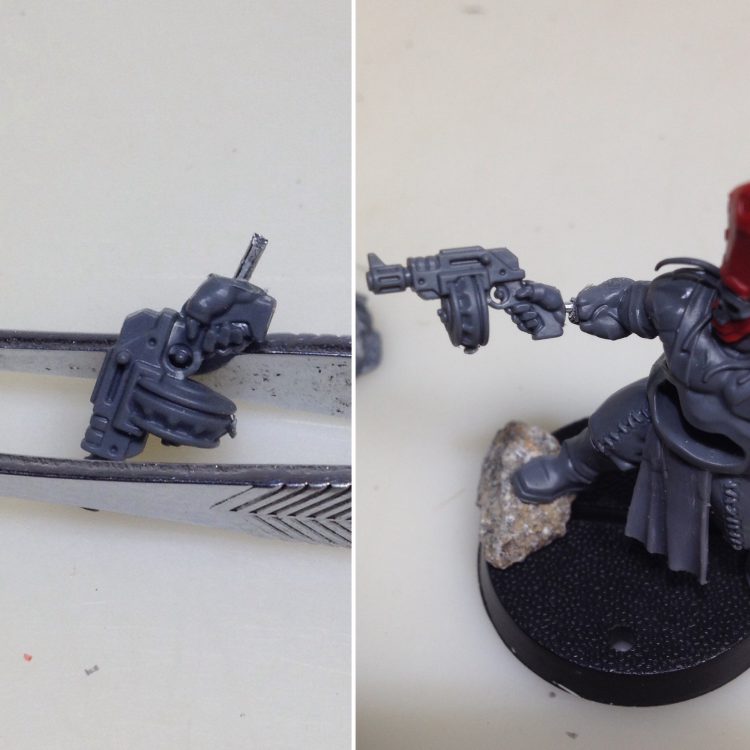 The autopistol is another bit from the Orlocks kit. The pistol is leaning to right in order the follow the lines of his wrist. The end result will look more natural when you take into account body mechanics as you build. It also gives this guy a more open, welcoming pose. A bit of paperclip was cut to space the hand from the arm where the wrist should be. Then a pin-vise was used to drill holes in the hand and arm for the paperclip, and the barrel was drilled out.