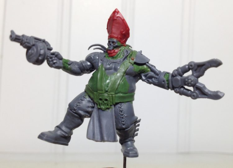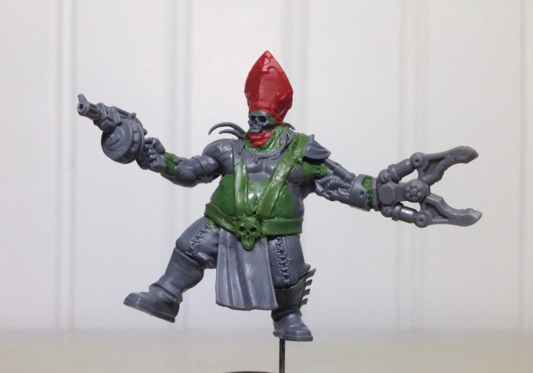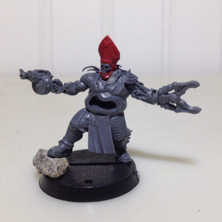 The gang slots pretty nicely into Necromunda Helot Cult. It brought to mind the question of who would fit into the Demagogue role for the gang. The characters fit nicely into the disciple, witch, and familiar roles. They are very cohesive as a gang, but none really stand out as the leader. From there, the idea for this build came together from figures and bits that were already on hand. The body would be from the Bloodstoker. I got this guy because he has a great whip bit I wanted for another project. Taddeus the Purifier's hat seemed like a great fit for the character, an official symbol of religious authority bent to his own dark ends. I had Taddeus because he's such a great Ministorum weirdo. From there it was just a matter of figuring out how to arm the Demagogue. Bits from the Orlocks sprue would help him fit in with the scheme of the rest of the band.