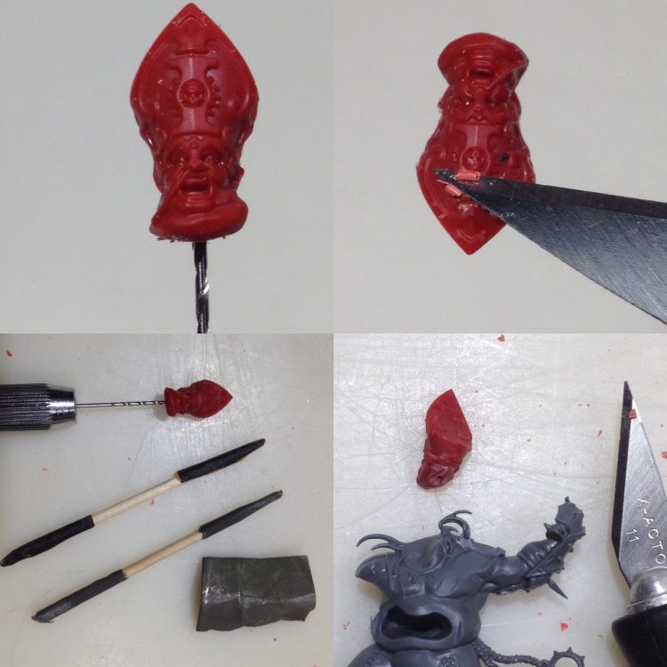 The Khorne logos were carefully carved flat with the x-acto and sanded smooth. (My fingers are only holding the model like this for photo reference, don't cut toward them!)