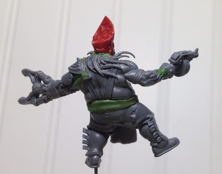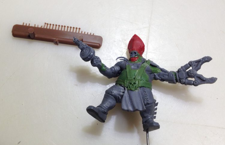 The rest of the crew is sporting nice loincloths, so he needed one as well. This one is a piece I had cut from a Space Marine torso. It originally had the Marine chest armor attached, but I have no idea what kit it came from. The top portion was cut off and the seals carved down with the x-acto knife, and then sanded smooth.