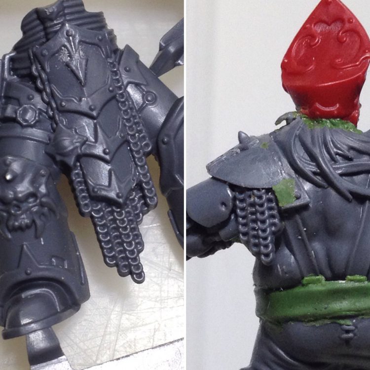 Finally, the idea of using chainmail to fill the gap between the arm and shoulder pad occurred to me. That gap really needed some way to bulk out the space and also provide a clear separation of robotics and shoulder pad. I could a nice piece of the right size on the new Chaos Space Marines sprue. It was cut off with the jewelry saw then carved and sanded to fit.