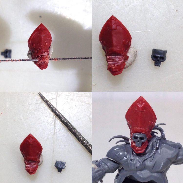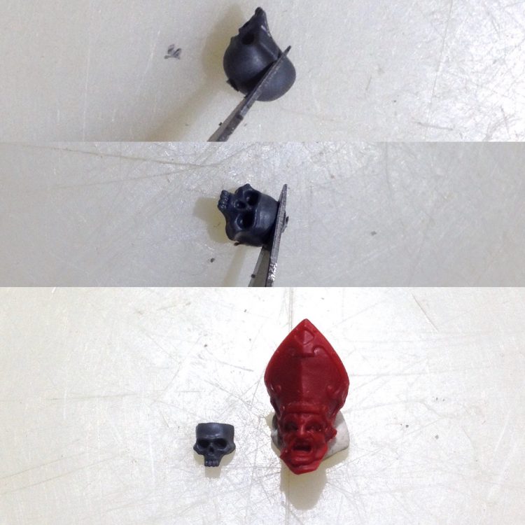 Now for the face. The back and top of a citadel skull are removed to fit over the face.