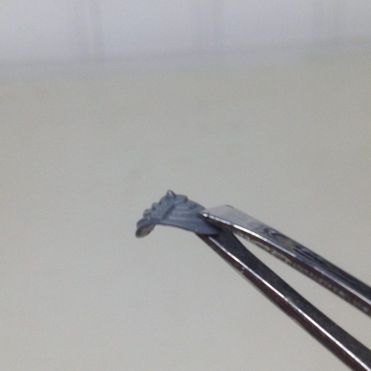Next comes the eyes and a rivet on the front bottom edge of the shoulder pad. These are done with Tichy Train Group .35 rivets. I drill a hole and leave a bit of the stems on to help keep them in place for glueing. The rivet on the shoulder pad was sanded flat on top. The ones for the eyes have some material trimmed off their edges so they fit neatly into the eye sockets.