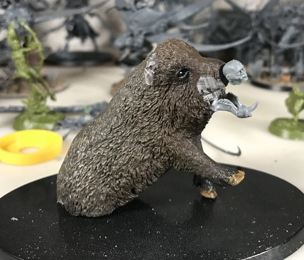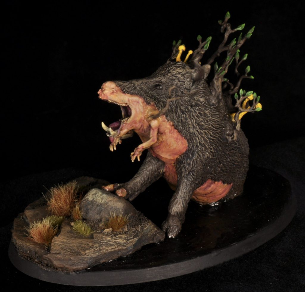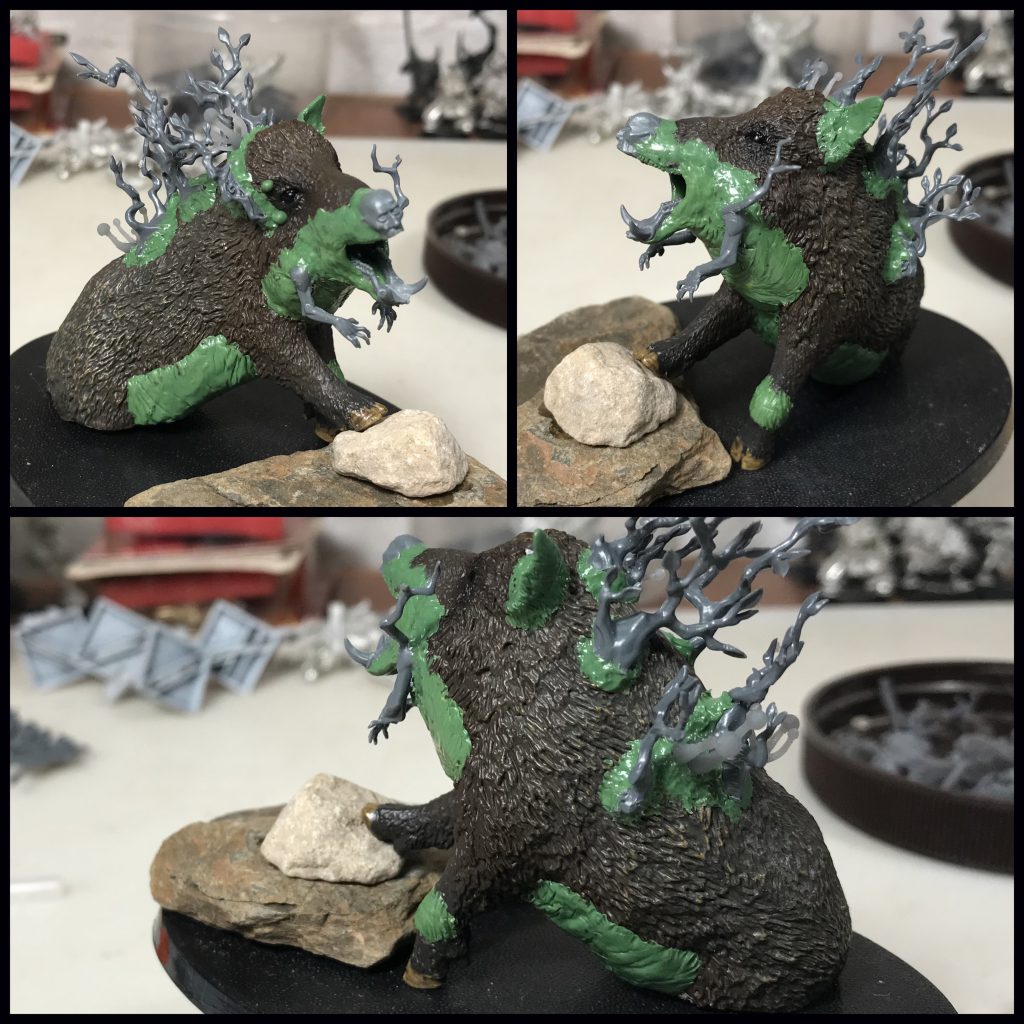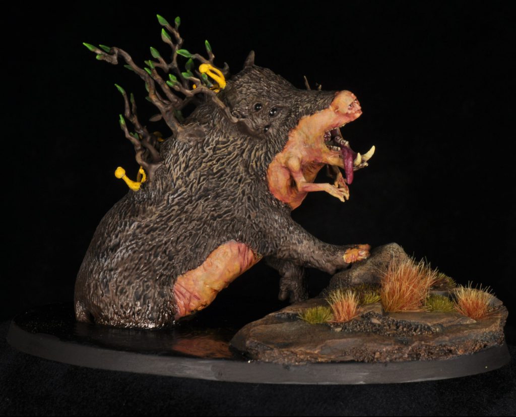 In addition to the boar and human aspects of this creature I wanted vegetation and mushrooms growing from its back. Arms from the Soulblight Gravelords Deadwalker Zombie kit with a branch emerging from its shoulder, and branchy bits from several Sylvaneth kits filled the role. Several mushrooms from 3d printed basing bits were glued to its back too.