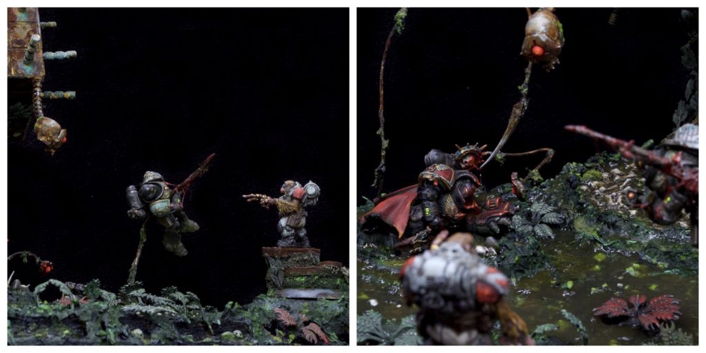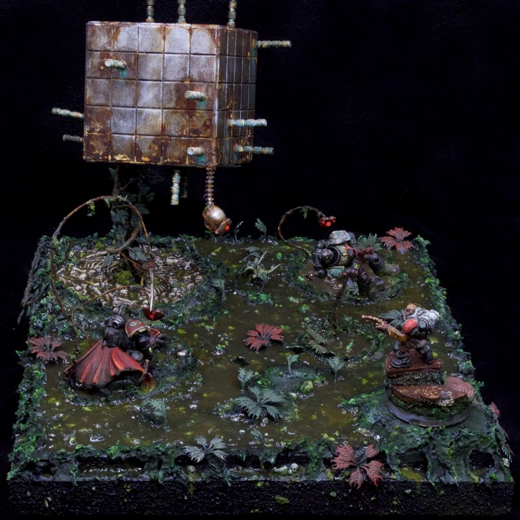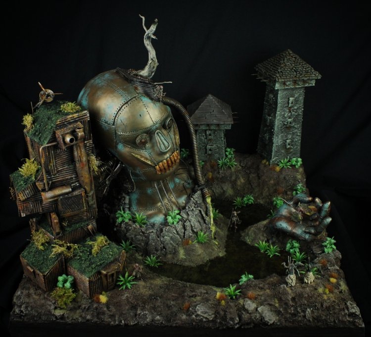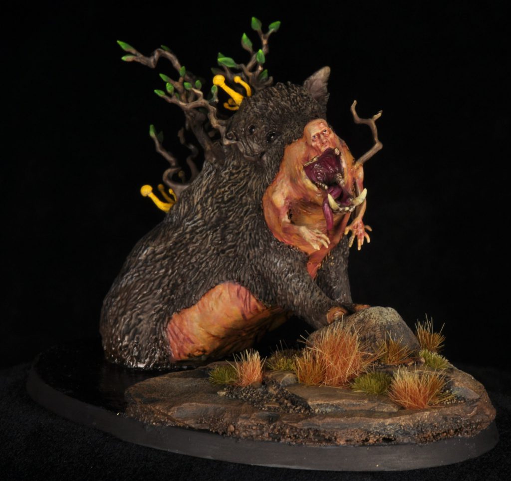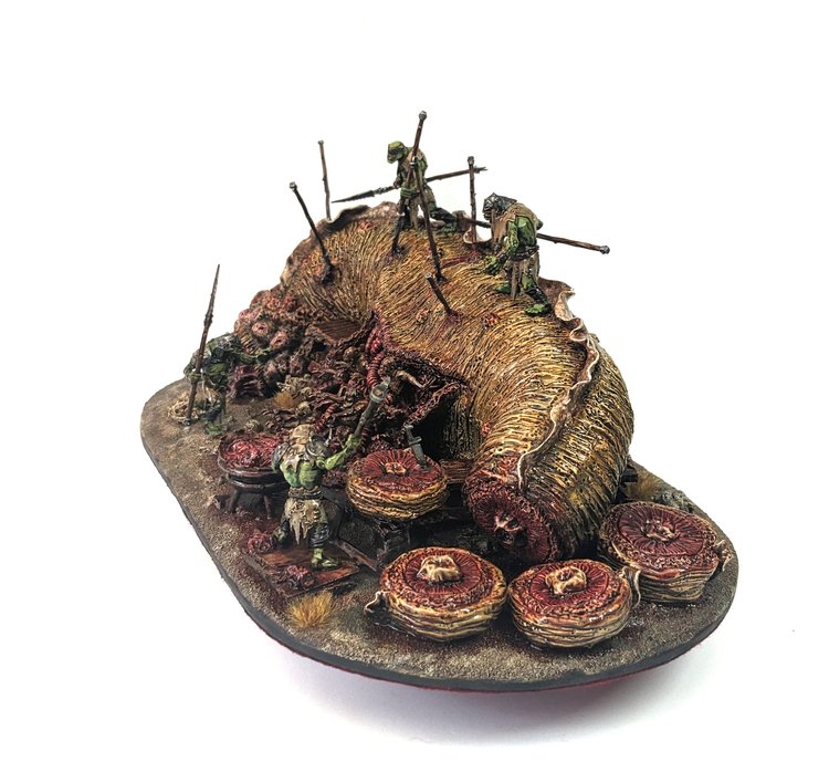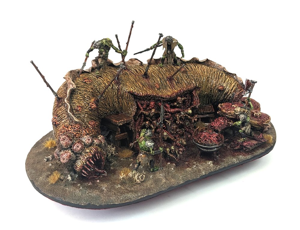 "This diorama tells a clear story, and its well done composition plays a big part in that. The modelling and painting are solid, and you can almost see the orcs hacking away at the flesh to create something otherworldly, or perhaps just to eat."