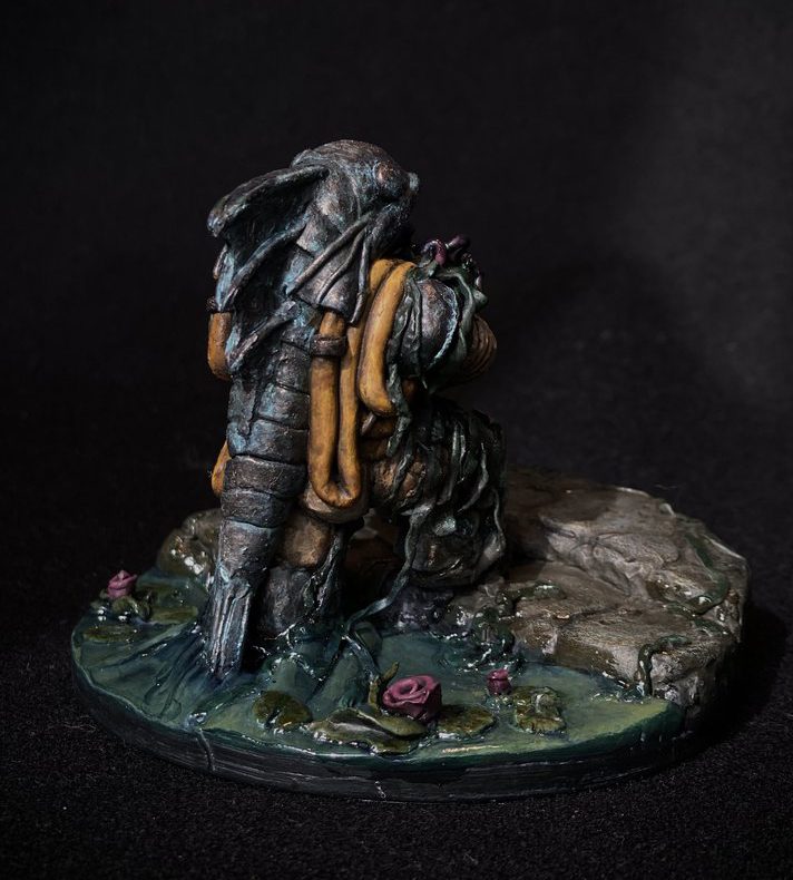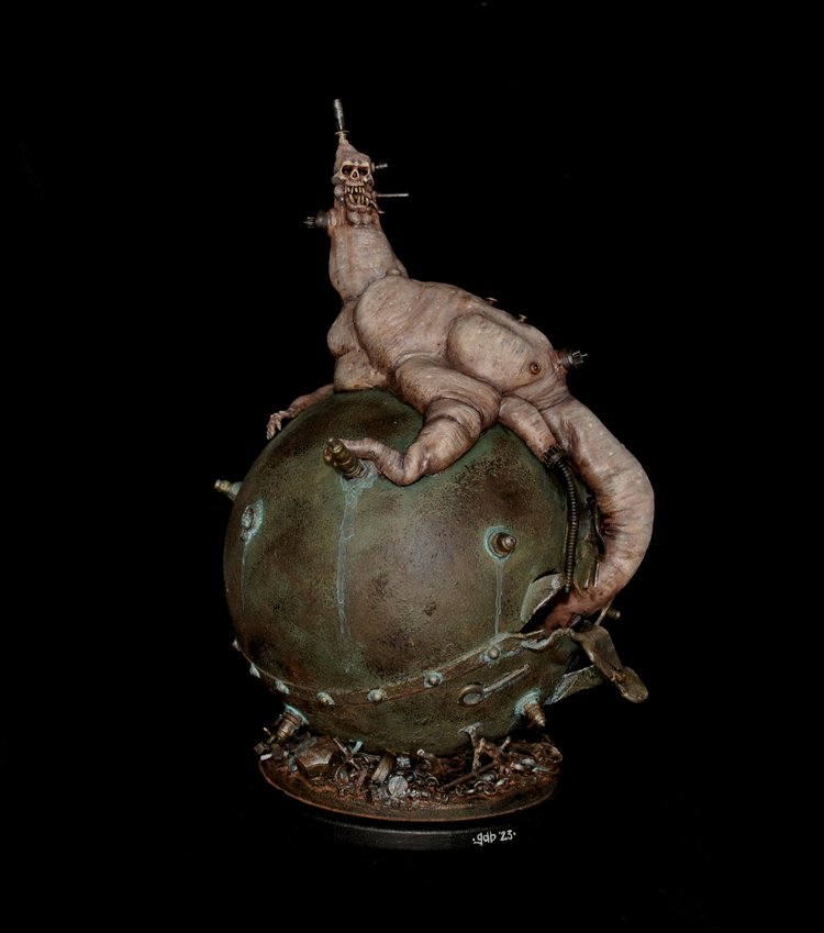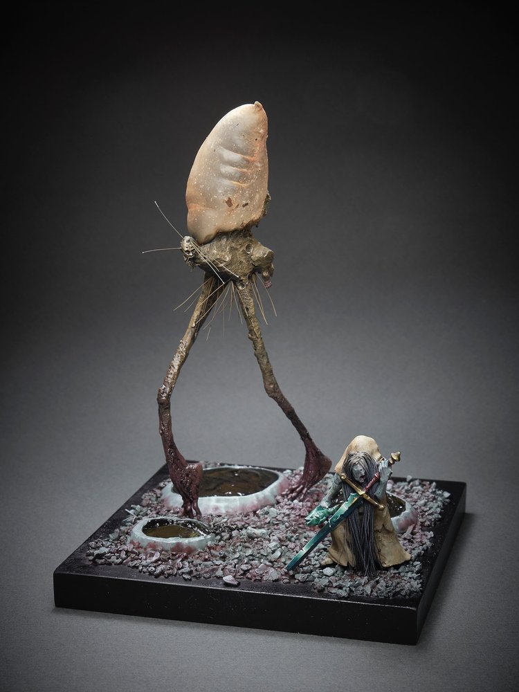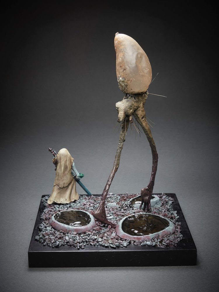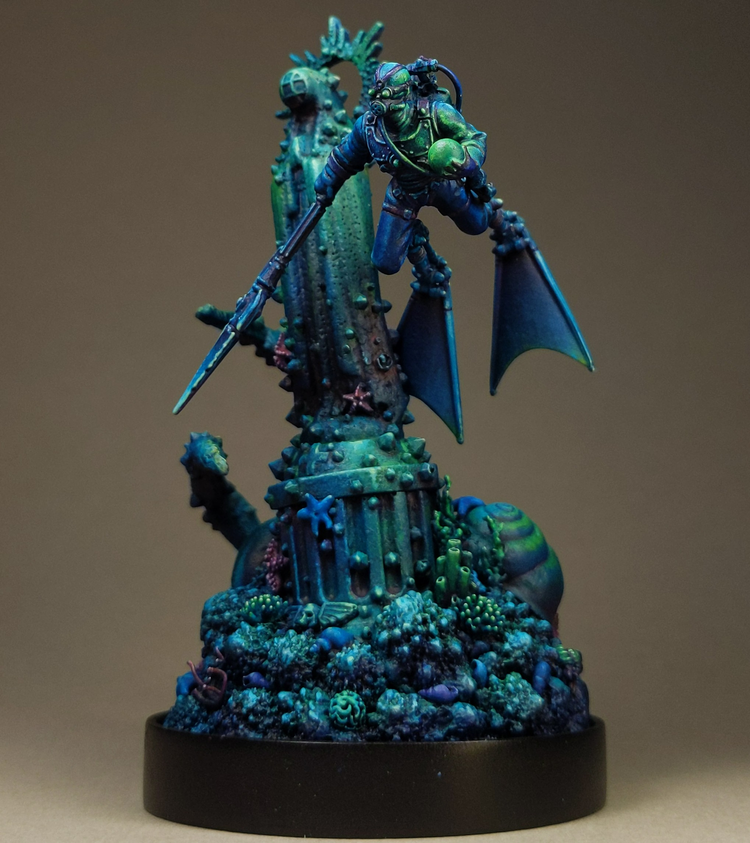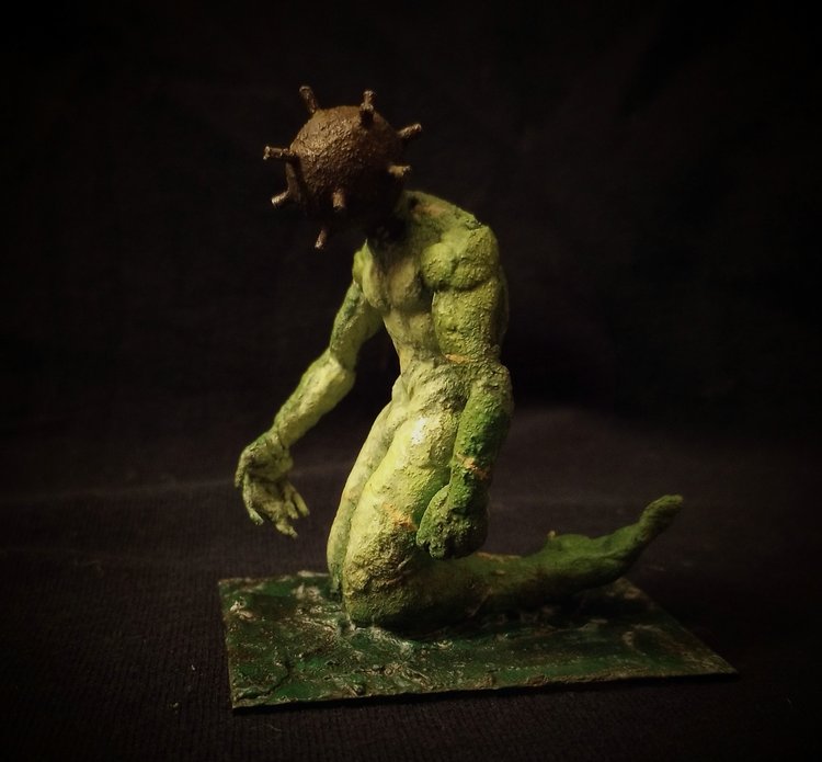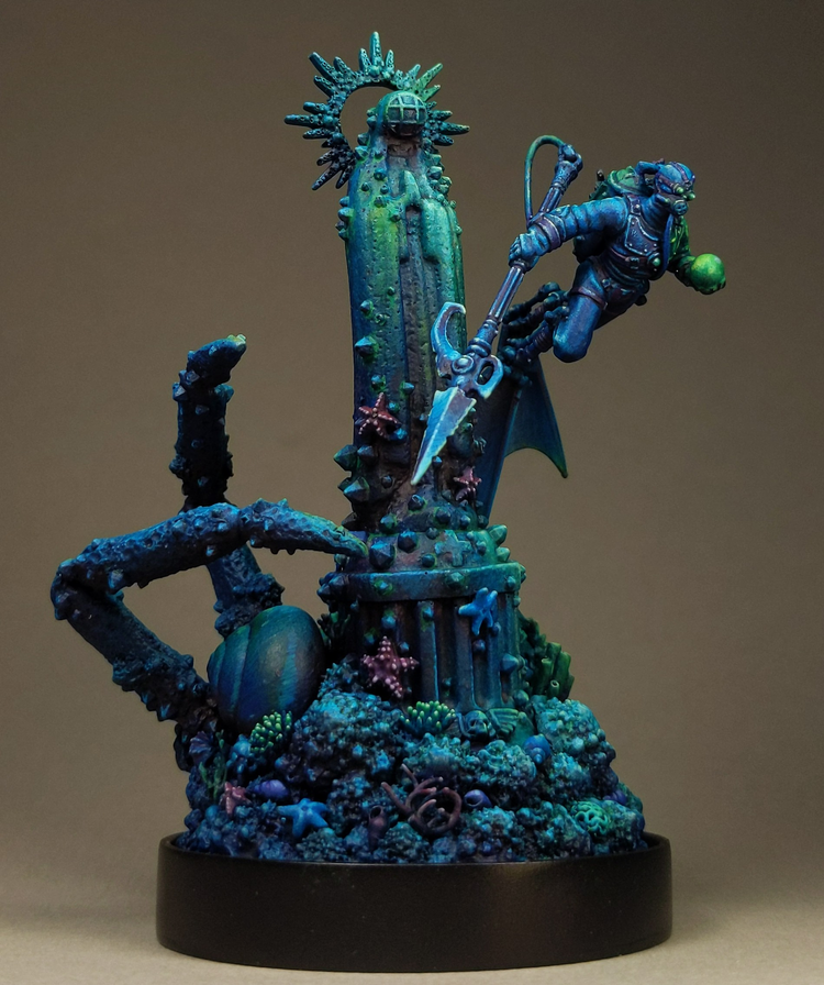 "The Sea mine for a head gives this merman an enigmatic and foreboding feel. Nicely executed pose and base, with a bunch of thoughtful sculpting. Really fantastic atmosphere, the earthy textures work really well against the unnatural colors, and the lighting is marvelous."