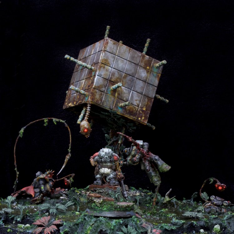 "Well done dynamic fight scene. The robot monster rightfully dominates the composition, and the action is clear and well executed with both modelling and painting. The scene works really well, and the cubic monstrosity is a nice mysterious graphic shape! Really great job capturing dynamism and stillness throughout, with a clear focus and great execution!"