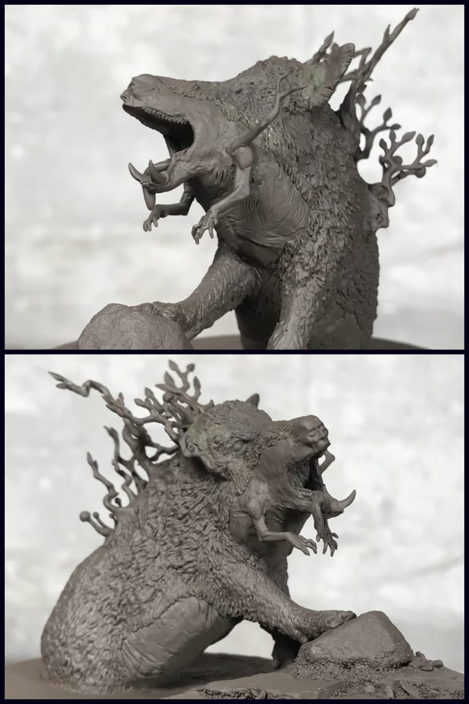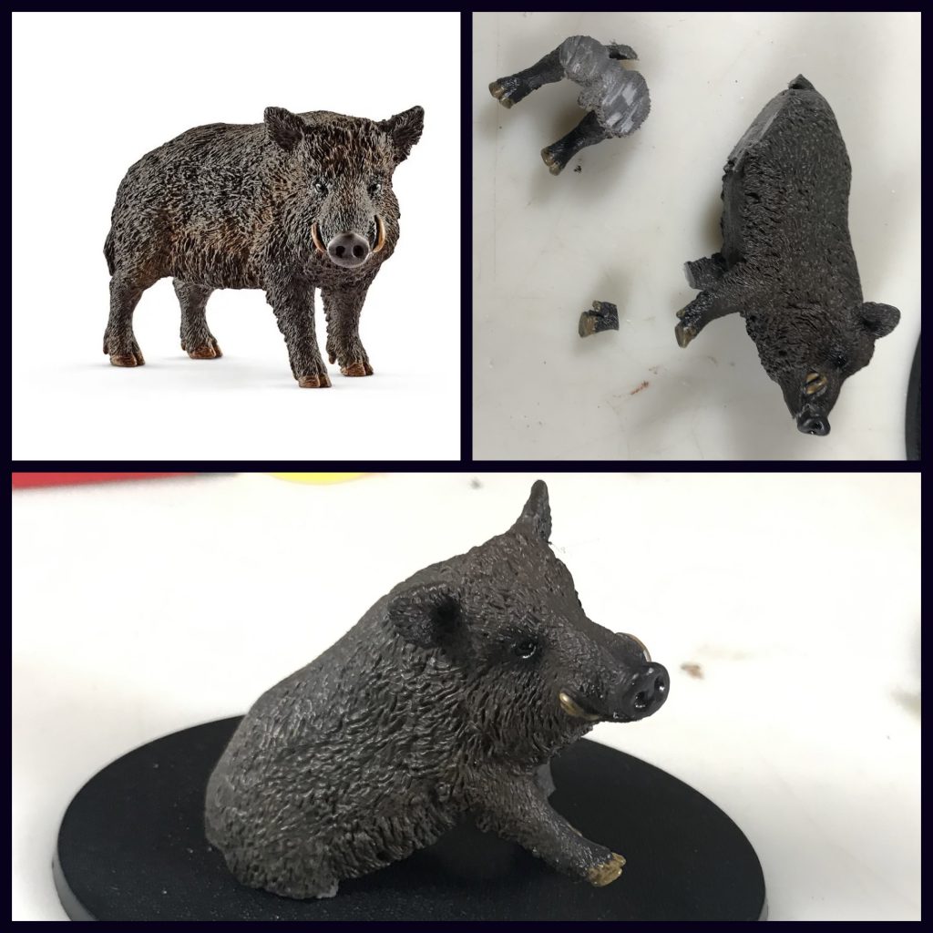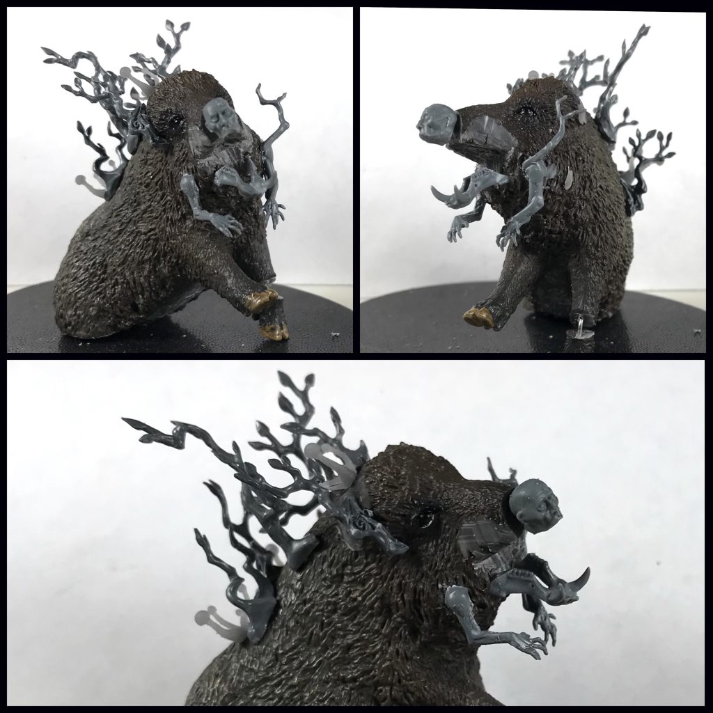 This spring I read the Southern Reach Trilogy (Annihilation, Authority, Acceptance) by Jeff VanderMeer. The story put me on the track to create this human/boar hybrid creature rising from black water. I started with a Schleich Wild Boar toy. It's hindquarters and left front hoof were cut off with a jewelers saw so that it could be coming off the base at an angle.