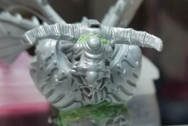 Next up was the head. I liked the idea of using a drone head on my DP to complete the fly look but it needed a better fit on the model and needed to look a bit beefier. I was able to achieve the result I was looking for by cutting the top off one of the standard daemon prince heads and fitting it onto the plague drone head for the blightlord, giving the daemon prince a more imposing look than if he just had a fly head.