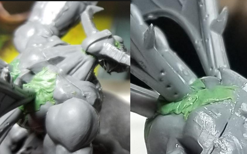 On the whole, the wings were pretty easy - these are literally globs of green stuff on the back of the model that I then jammed the wings into to create the appropriate divots to glue later. I've done the wings in an up position, and I think it looks OK, but if I had to do this again, I think I'd consider having them down in a more relaxed position to reduce the profile of the model and make him easier to transport and store.