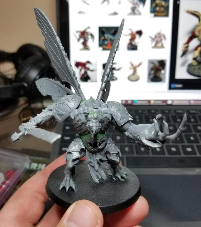 Overall I'm very happy with how he turned out. He's a visual improvement over the standard Daemon Prince, and looks appropriately Nurgley without spending a ton of effort or attempting to do extra green stuff work that I wouldn't have been confident doing. He gets the visual point across and is striking enough to get someone to look closer at the model but also didn't take forever and is clearly still in the same visual/physical foot print as the plastic winged daemon prince.