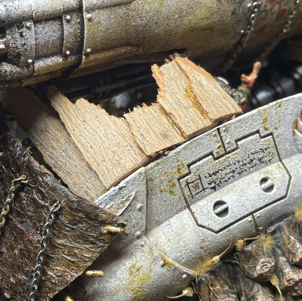 Maintaining natural materials of all types on your models is as simple as keeping them dry. Luckily, you already do this! Keeping moisture off your models will eventually lead to desiccation, which will arrest most decomposition. If you’d like to boost the longevity of your materials, you can use the same techniques as preserving paint jobs – varnish, sealant and keeping them clean and dry. If you really want to preserve a particular look forever, and you have a lot of patience, you can water down some PVA and place one end of the wood/bark/lichen into it. The PVA will be drawn into the capillaries and – to some extent – the entire fabric, giving you an extremely budget and not particularly effective version of plasticization. Two Part Epoxy resin also works with tougher materials in the same way.