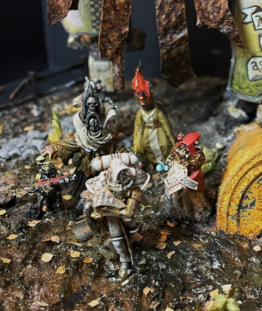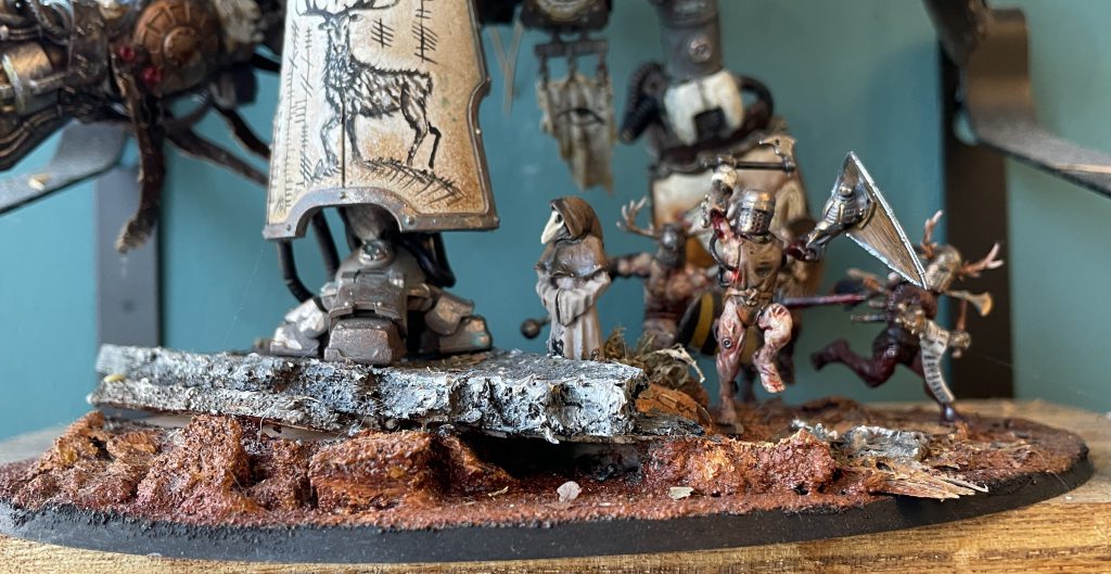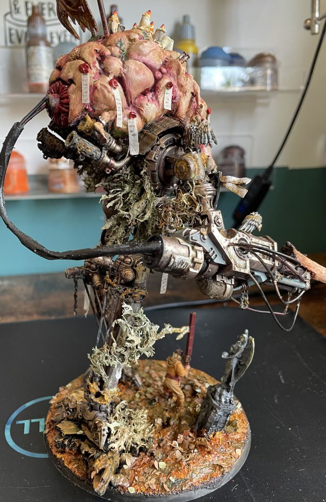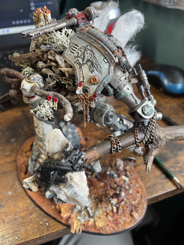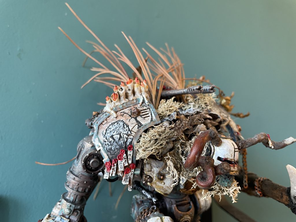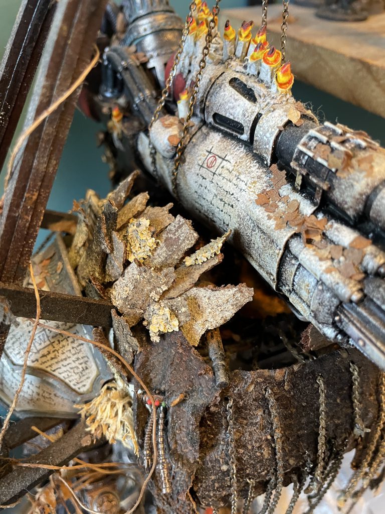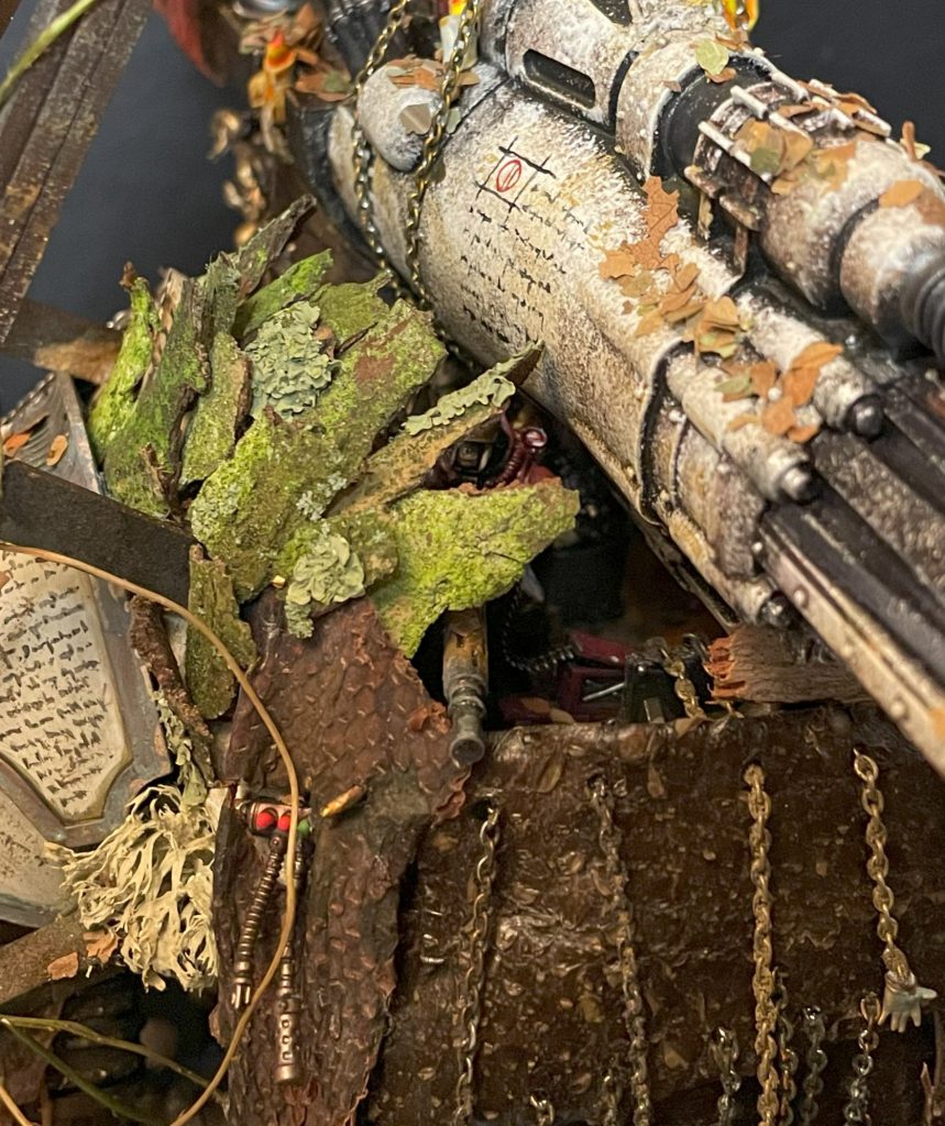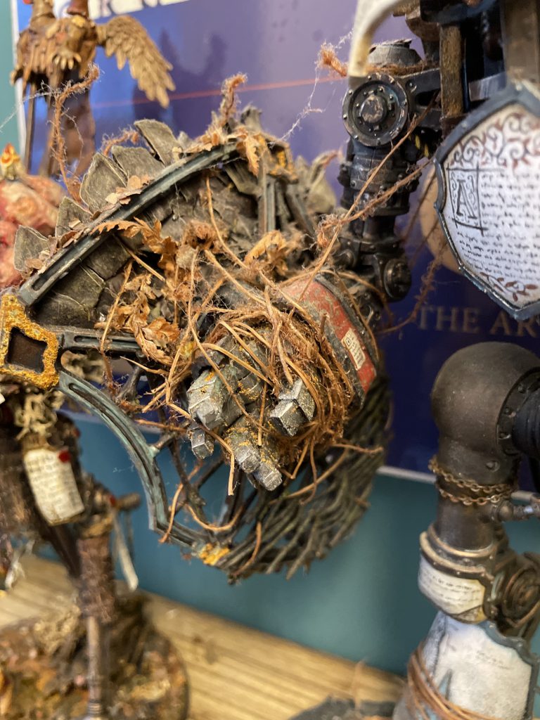 It's not all doom and gloom – the look of a model that incorporates natural materials will change over time, which is a beautiful and strangely touching thing. The bark covers of my Porphyrion have faded and weathered into the same colour scheme as the plastic – almost (but not actually) as if this process was planned to compliment the colour scheme. Time acting on plant based materials is a good thing, and will create unexpected moments of beauty, even poignancy, as your models change and decay.