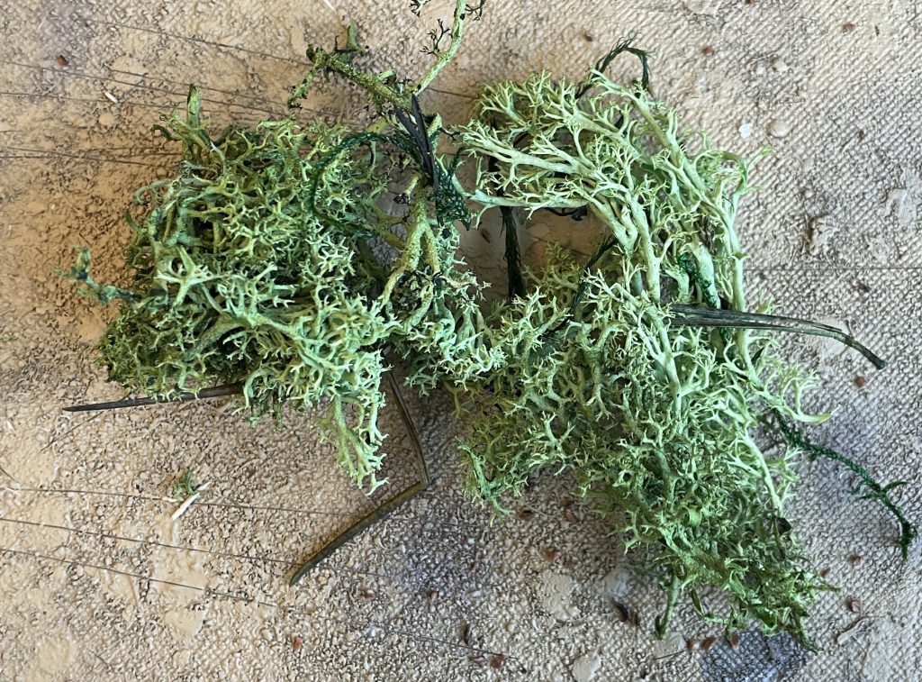 Fruticose lichens are the branching shrub-like lichens that are often sold - in rubberised form - as modelling material. You'll often find small clumps of these fallen from trees, and can be stuck straight on to your models.