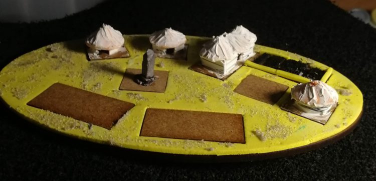 The round houses were made by simply cutting a strip of foam and curving it into a circle with a small gap between the ends. I glued this to the base and then cut another, a little longer this time, and formed it into a circle and glued it on top of the first ring. With this done I formed a little conical roof (cut the foam into a circle then cut out a triangular slice on one side and then pull the edges together) and popped it on top. Simple! I smoothed over the gaps with some filler - you can use anything you like, I use my trust Vallejo ground effects smooth marble mix. Primed, painted and with a little flock, and it looks great.