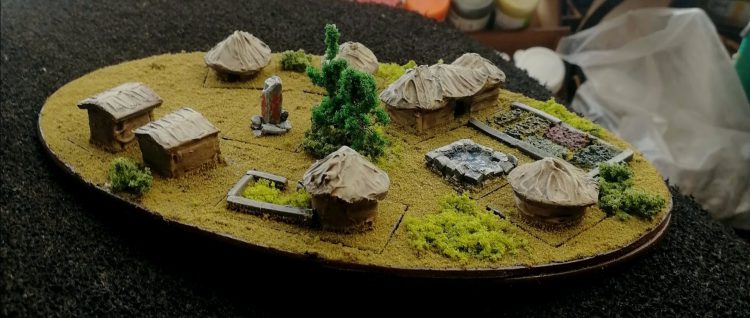 With all of the pieces on small bases, I stuck a piece of foam over a large oval base, cut holes for the bases in it, and then fitted in foliage and ground cover to make it blend more naturally. That way you can either use the whole village, or you can take a single item out and put it wherever you like. At some point I’ll be building a series of boards that will take oval bases of this size in slots, to let you modularly switch around your terrain with a lot of flexibility.