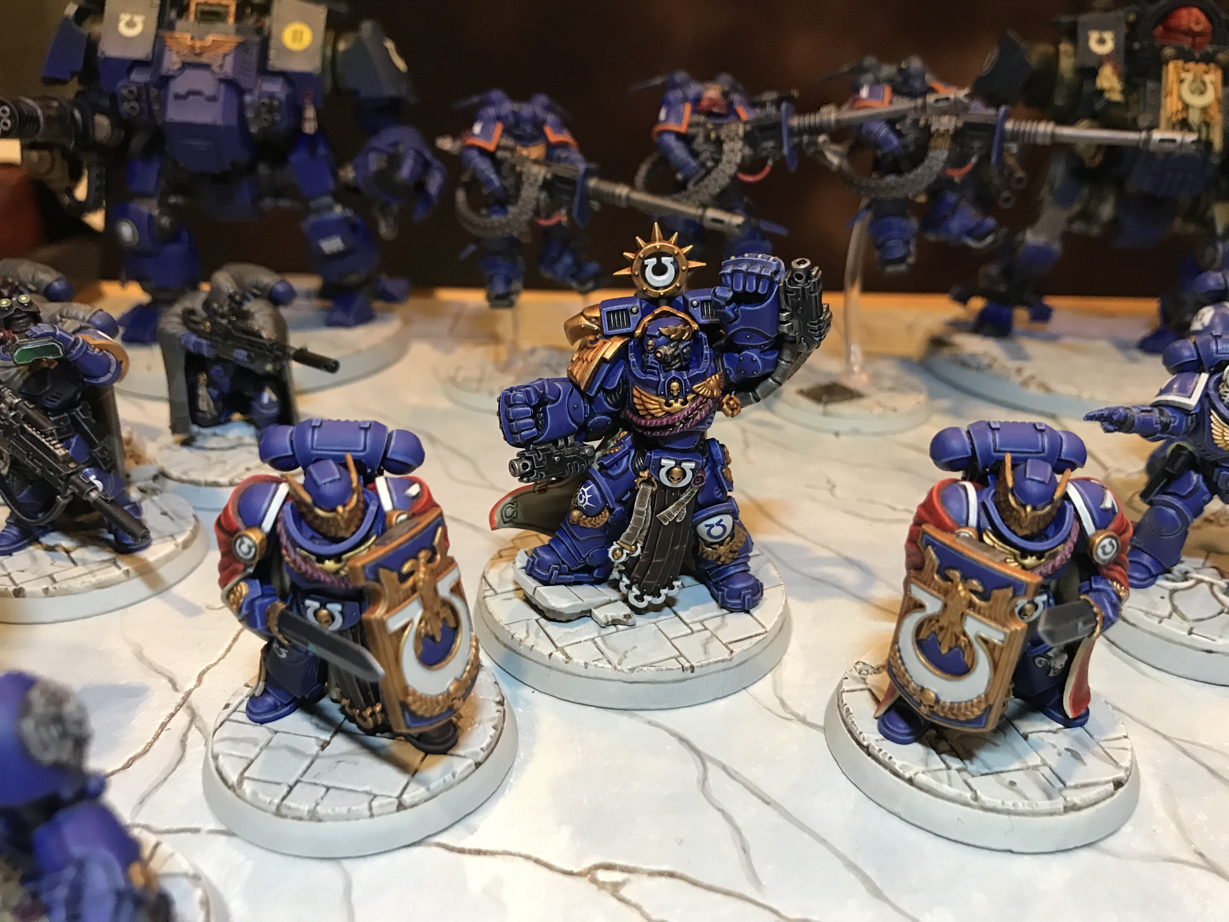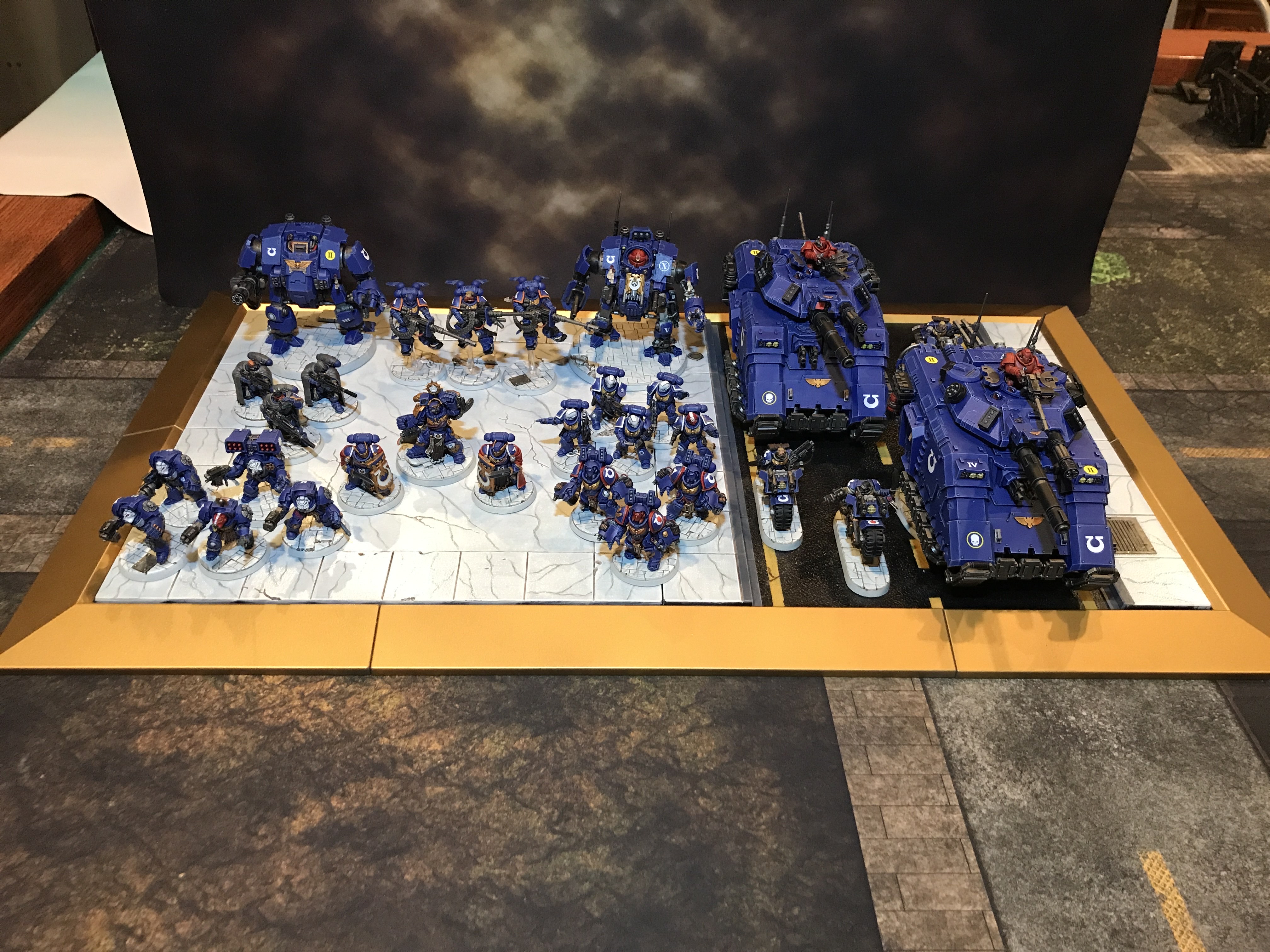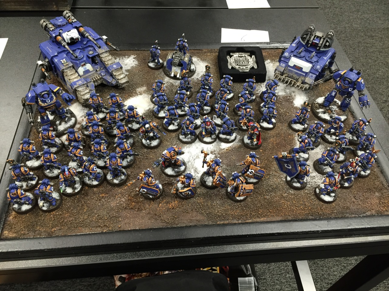 I mention this distinction to segue into what makes a good rubric and judging. With a solid rubric, I think anyone decently familiar with painting or the hobby could be expected to follow it. Since our goal as miniature painters for a tabletop game differs from other end goals like competitive painting, our rubric should reflect what we want to achieve. An army that achieves max points on a good rubric will look good from 3-4 feet away, but also have details visible from a foot or less away (shoulder pad details on marines, for instance). The max-scoring army should have differentiated units (i.e., squad markings) and at least some overall visual cohesion. This last part is one of the most-subjective points for a rubric and is one that is easy to get wrong, in my opinion. The best way to tie in an army with some cohesion is a display board. It’s almost like I knew the questions ahead of time, and set myself up for the next topic...