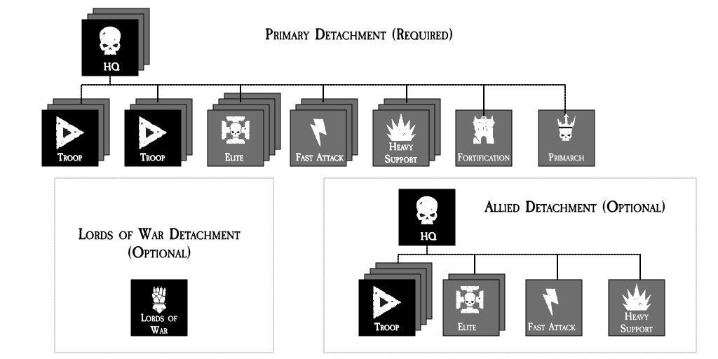 The Horus Heresy doesn’t operate on the same detachment model as Warhammer 40,000. There are only three choices of detachment – a Primary Detachment which you must take, and two optional add-ons that can expand on that Primary detachment in limited ways. Each detachment comprises a mix of Compulsory and Optional unit slots. Every army must have one HQ and two Troops, ensuring that you’ll have a leader and some ability to take objectives... and that you can't just pile on specialty units. Note that some units can’t be used to fill Compulsory choices – these units have the Support Squad special rule.