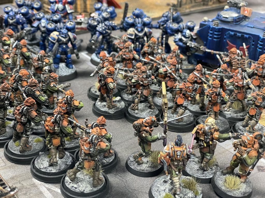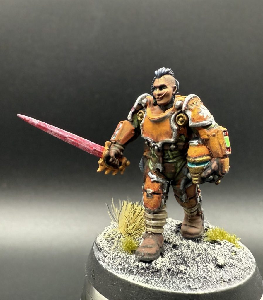The background for the army only started to coalesce early on in the narrative campaign last year, even though I had painted assorted units in a striking dark orange and green scheme since my early days collecting the army almost a decade prior. The Auxilia’s lore has always been a bit nebulous, especially in the first edition of Heresy, so I had a lot of leeway with creating the 519th’s background. I came up with a force raised from void clans living in a solar system that had once been the center of a small space empire, only recently brought into the Imperium. The people of these clans live deep within the asteroids, with only those that could find their way to the void-facing surface of their asteroid habitats and survive being inducted into their clans’ warrior caste, and receiving the title of “Sunborne”. When first asked to raise troops for the Great Crusade, a Solar Auxilia cohort was founded to build on their void warfare expertise. Attached to the 1819th Expeditionary Fleet, the cohort often served alongside the 164th company of the XVIII Legion Salamanders (my Salamanders army).
