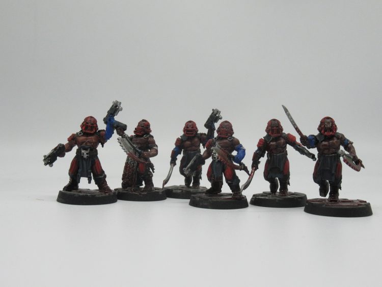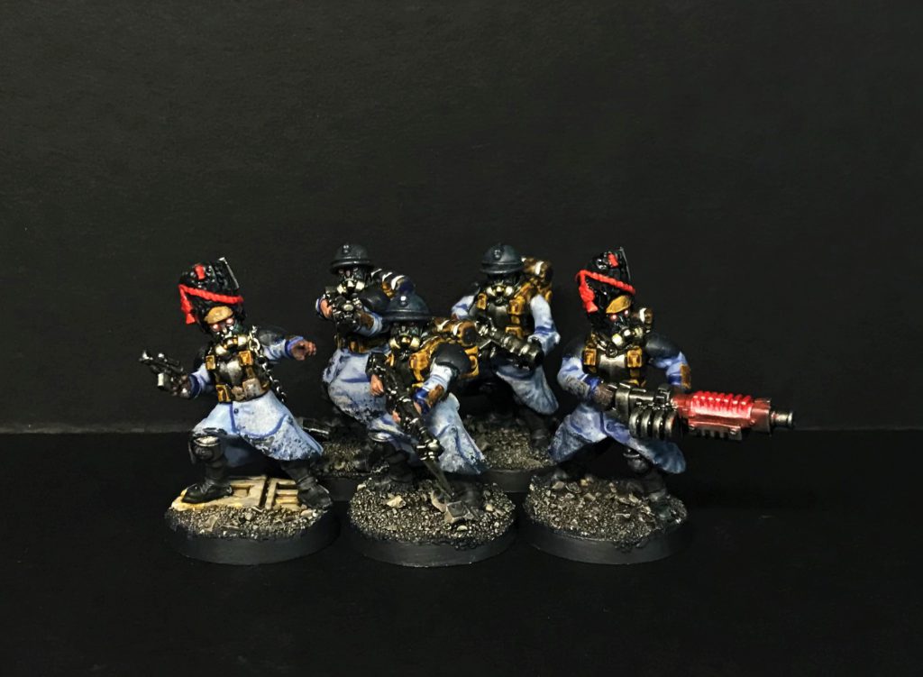 Remember the Salvar Chem-Dogs? Turns out their ancestors are here - stimm-using, drug addicted infantry with a fair immunity to falling back and the potential for frenzon injectors giving them furious charge. There's a lot of options you could go for here - Goliaths again would be pretty great - but a simple recommendation would be rebreather or other closed mask heads on whatever infantry bodies you want to use.