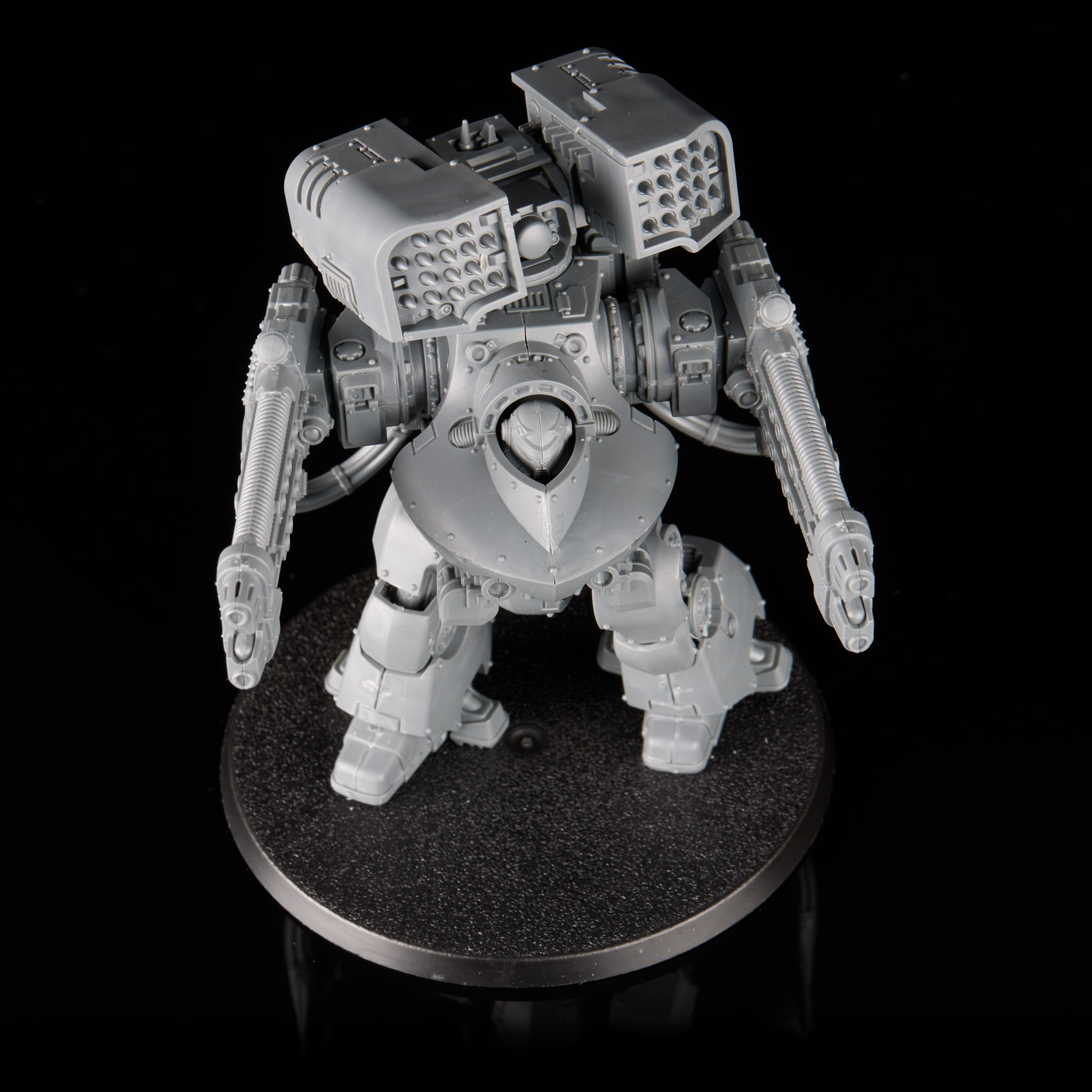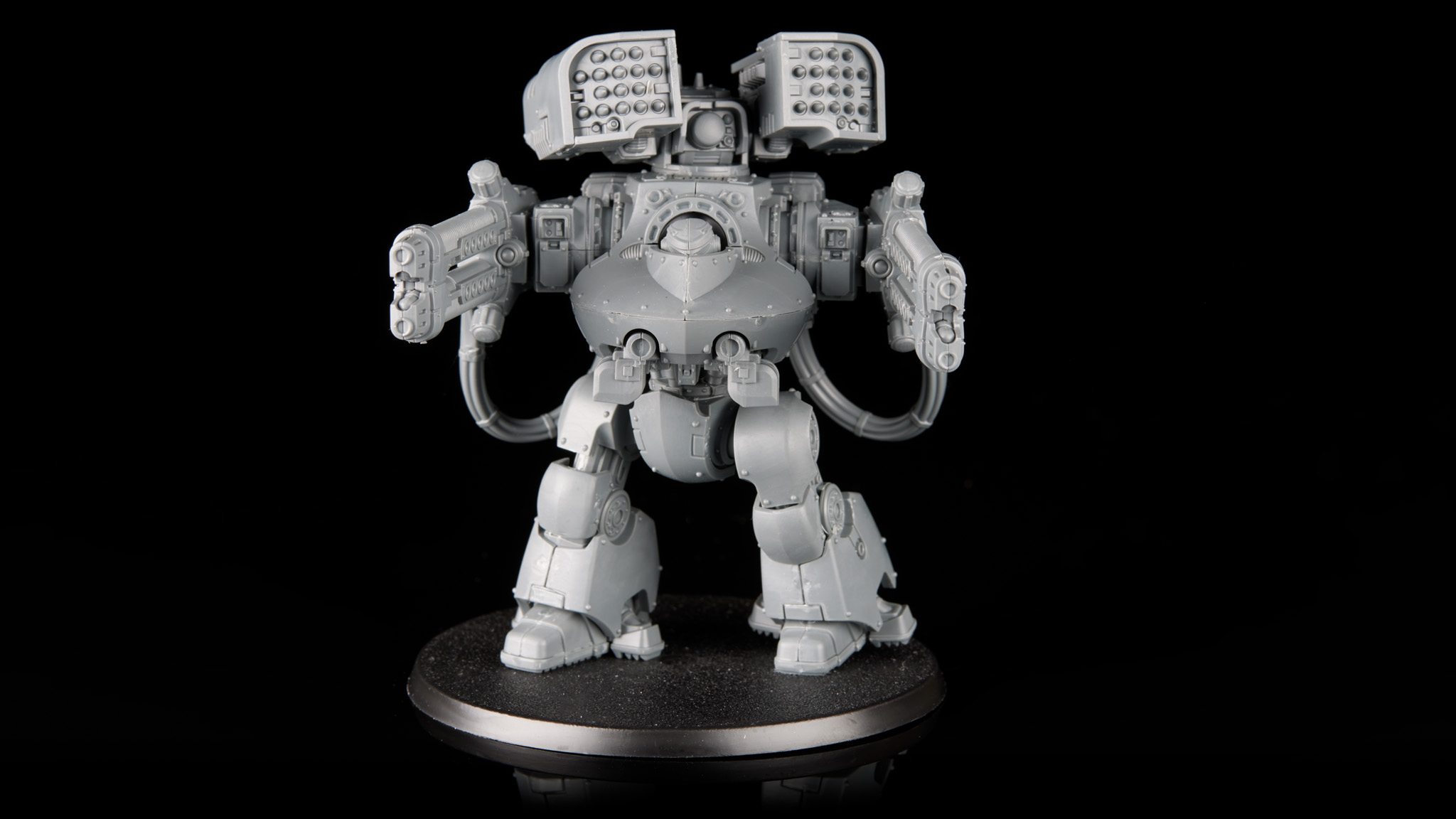Cerastus Knights. As a double hit, the default arm pose sucks, with the arms not even pointing in remotely the same direction. Like the torso they do have magnet holes so you can swap between plasma and autocannons. That will, however, make it a bit harder to get the weapons into a decent pose. With glue and clamps I think you can force the cables to behave with the guns looking better, but if you're relying on the magnets then it's going to be a huge amount of work to change their position.