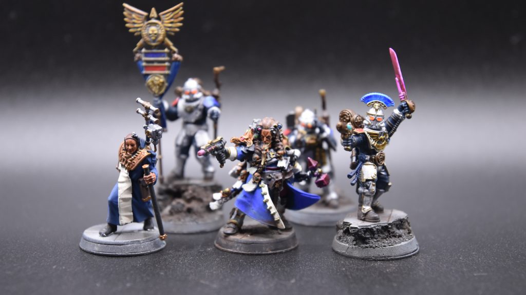 - Legate Marshal w/ Paragon Blade and Archaeotech Pistol, 9 Lifewards with Blast Chargers, Command Vox, Augury Scanner, and Cohort Vexilla, meltabombs
